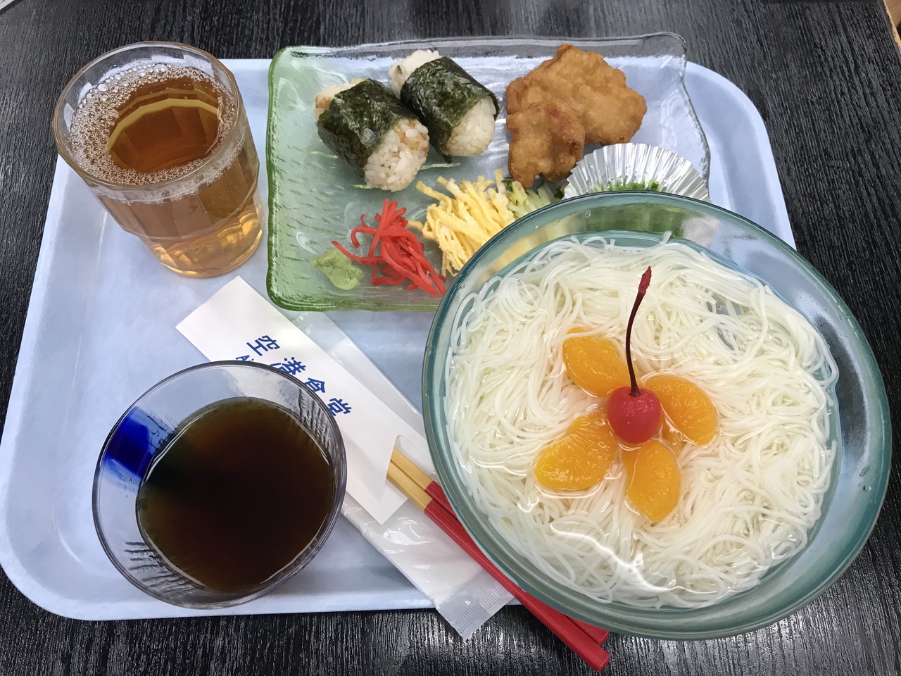 缶詰の果物が入った冷たいソーメンにチキンの唐揚げとじゅーしーのおにぎりがつく。