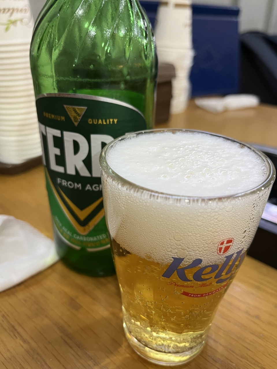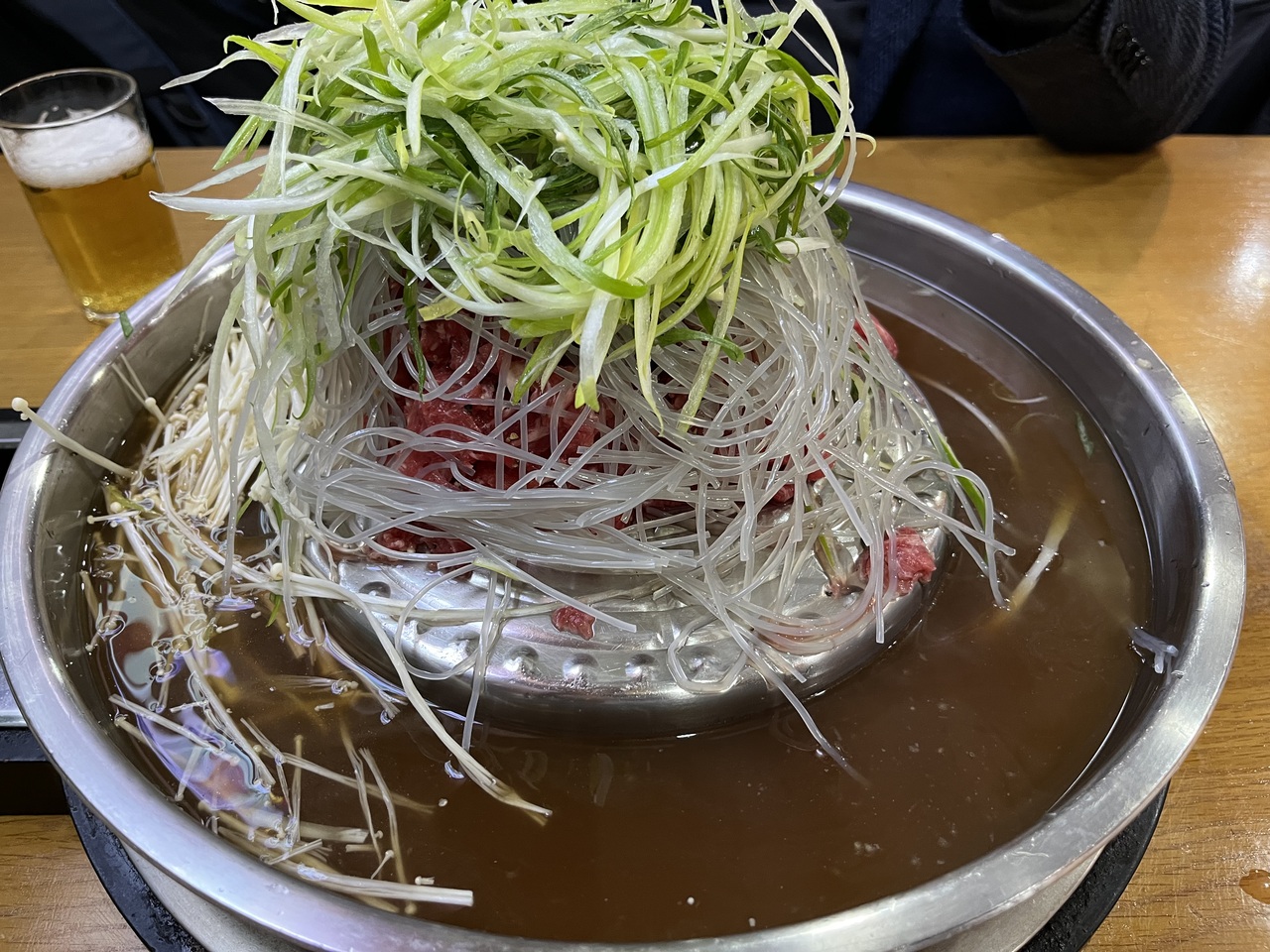 肝心のプルコギは肉の上にお出汁をよく吸うであろう太目の韓国春雨と細く切った葱(緑色の部分が多いので白髪ねぎではない)がタワーのようにのっているのだが、火をつけるとどんどん下に下がっていく。たまったスープは肉、野菜の味がよく出ているようで美味しい。また、スープは煮込んでいくと味が濃くなるので、ビールが進む。また少し濃いめの肉はサンチュに包んで食べると美味しい。