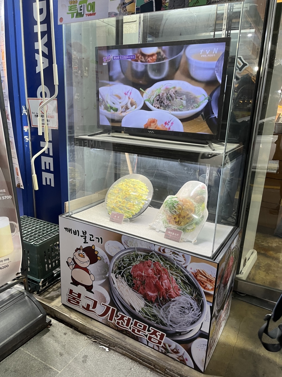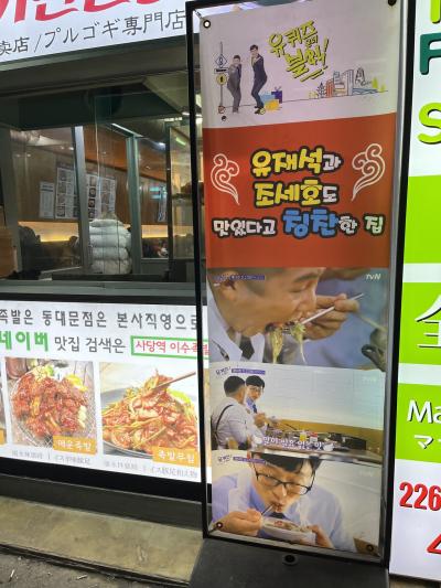 韓国の飲食店あるあるだが、テレビ番組で紹介されたようでタレント(アナウンサー?)が美味しそうに食べている画像が貼ってある、人気のある店の証拠なのかな。