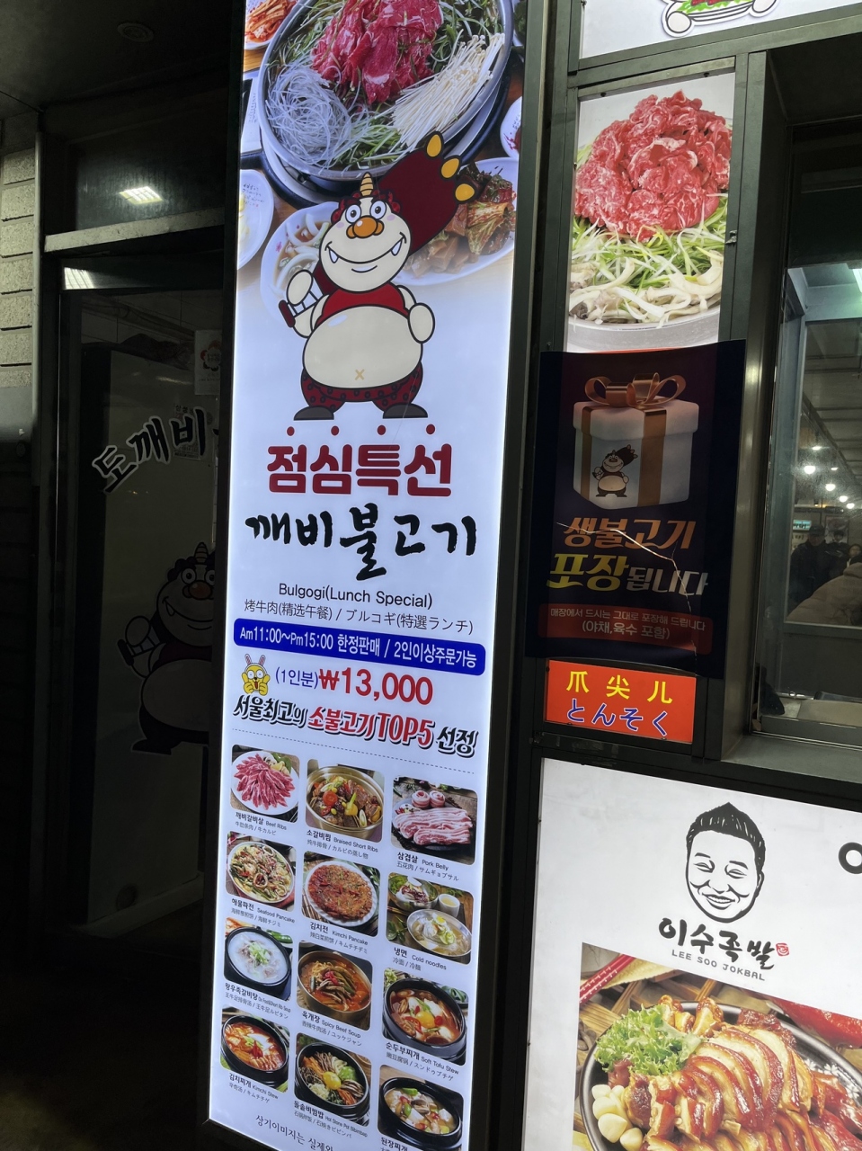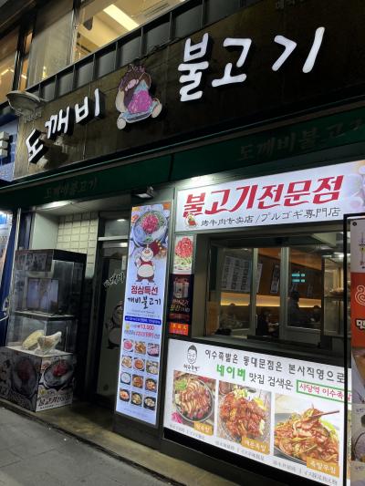 東大門、現代シティアウトレットの近くにあるプルコギ専門店。場所柄24時間営業。看板のお腹を出したキャラクター(牛なのかどうかは不明)が面白い。