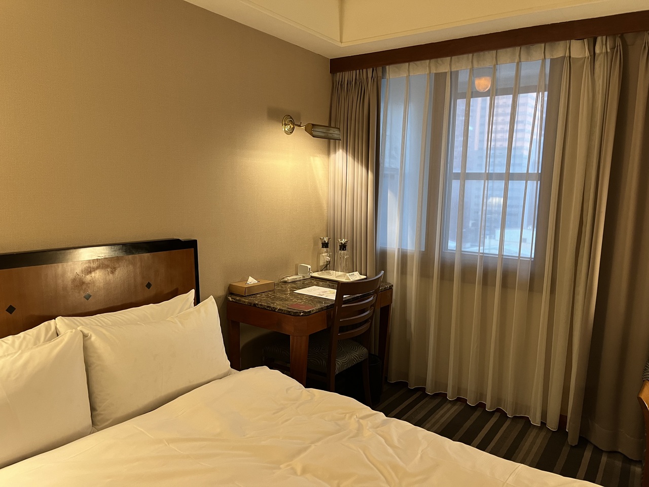 客室は昔ながらのシティホテルの感じだがリニューアルはされており、快適。木の枠の窓が