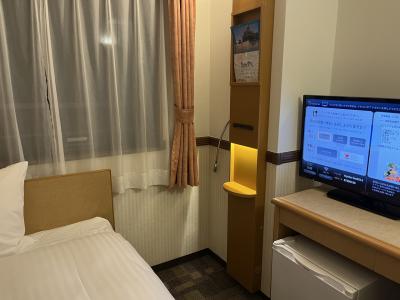 ミッドナイトプランで宿泊したので覚悟はしていたのだが、部屋は他の東横インよりも若干狭め。部屋の大きさに比べベッドが大きい。ベッドの下には空間があって大きめのスーツケースも収納可能