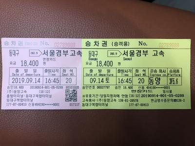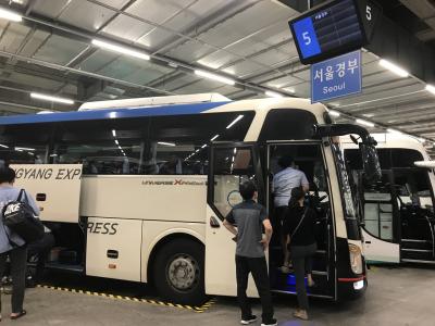 バスターミナルは5階建て、3階と4階がバス乗り場だが、乗車券売り場は3階にある。コンビニや飲食店も多く使い勝手が良い。乗車券用の自動券売機も多くあるが、クレジットカード専用(韓国以外発行のクレジットカードの場合、多少使いづらいかも)。一部の案内は表示には日本語もあるが、乗車券には出発時間、出発階・乗り場が数字で書いてあるのでわかりやすい(今回はソウル行きを利用)。