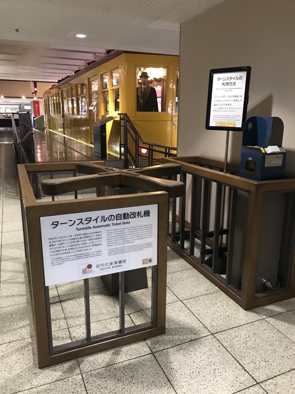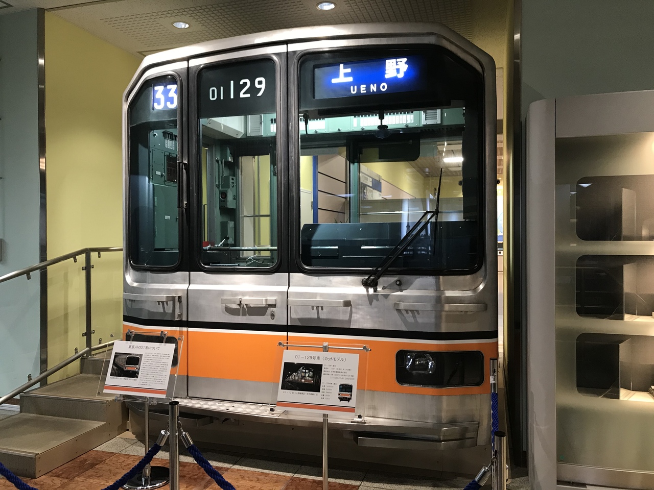 改札を模したエントランスを進むと、日本初の地下鉄車両1001号車(重要文化財)と丸ノ内線で活躍した300系がお出迎え。丸ノ内線300系は車内に入ることも可能。登場時に復元された車内や、開業時の路線図などレトロな感じが満載(車体だけなら目の前の環七通りからガラス越しに見ることも可能)
