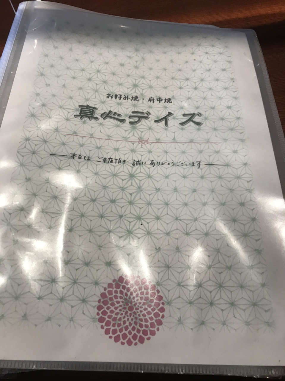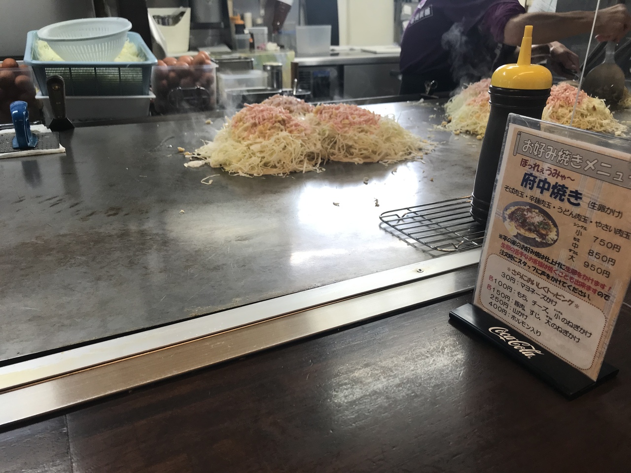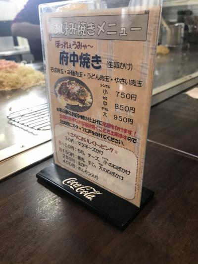 府中焼きはお好み焼きの上にミンチ肉をのせて焼く。ミンチ肉から脂が出るので、表面がパリパリになる。また、仕上げに溶いた生卵をかけ、葱、削節をのせるのが特徴(苦手な人ふ焼くことも可)。生卵が半熟の感じになって良い。ダブルを頂いたが、お腹いっぱいになった。また行きたい店。