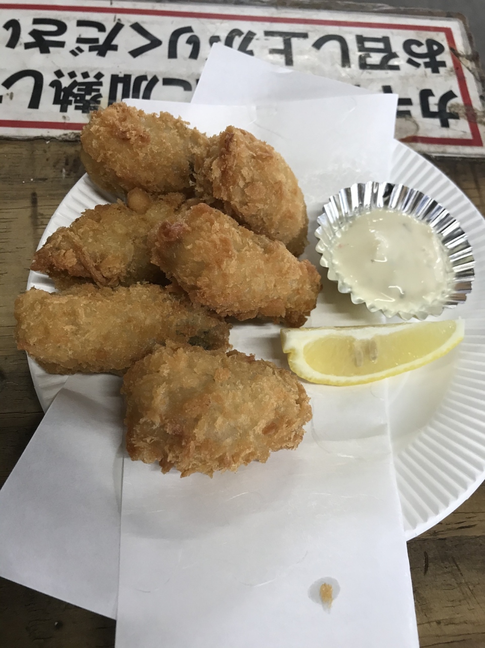 焼牡蠣は表裏3分ずつ焼き、平たい方の殻を外して再度焼き、出来上がり。ポン酢か塩で食べる(レモンやバターもあるが別料金)。牡蠣はよく焼いてもミルキーな感じがあって美味しい。その他牡蠣フライを注文。こちらも美味しいが焼牡蠣にはかなわないかな。