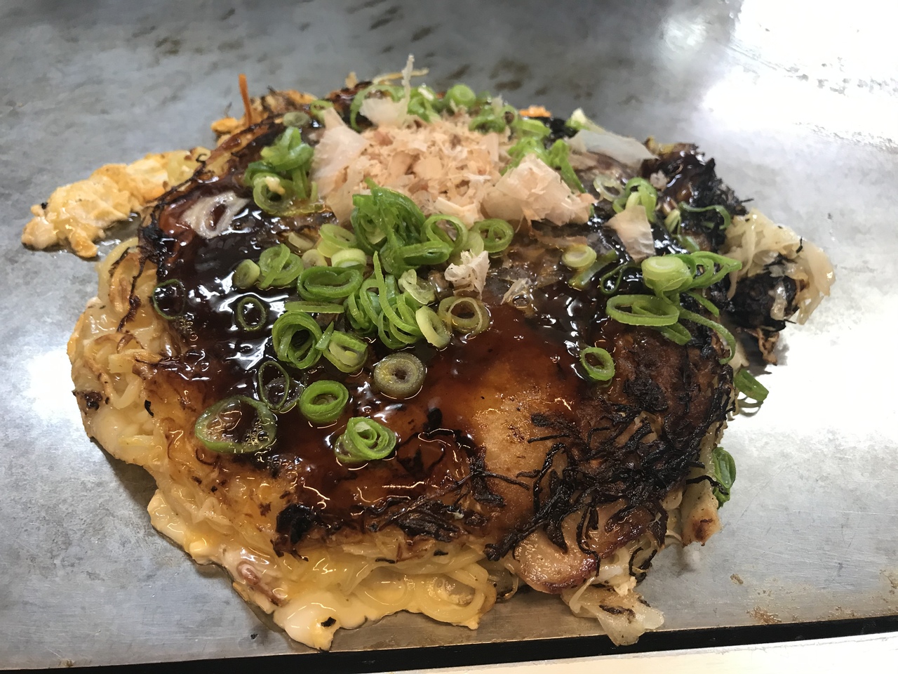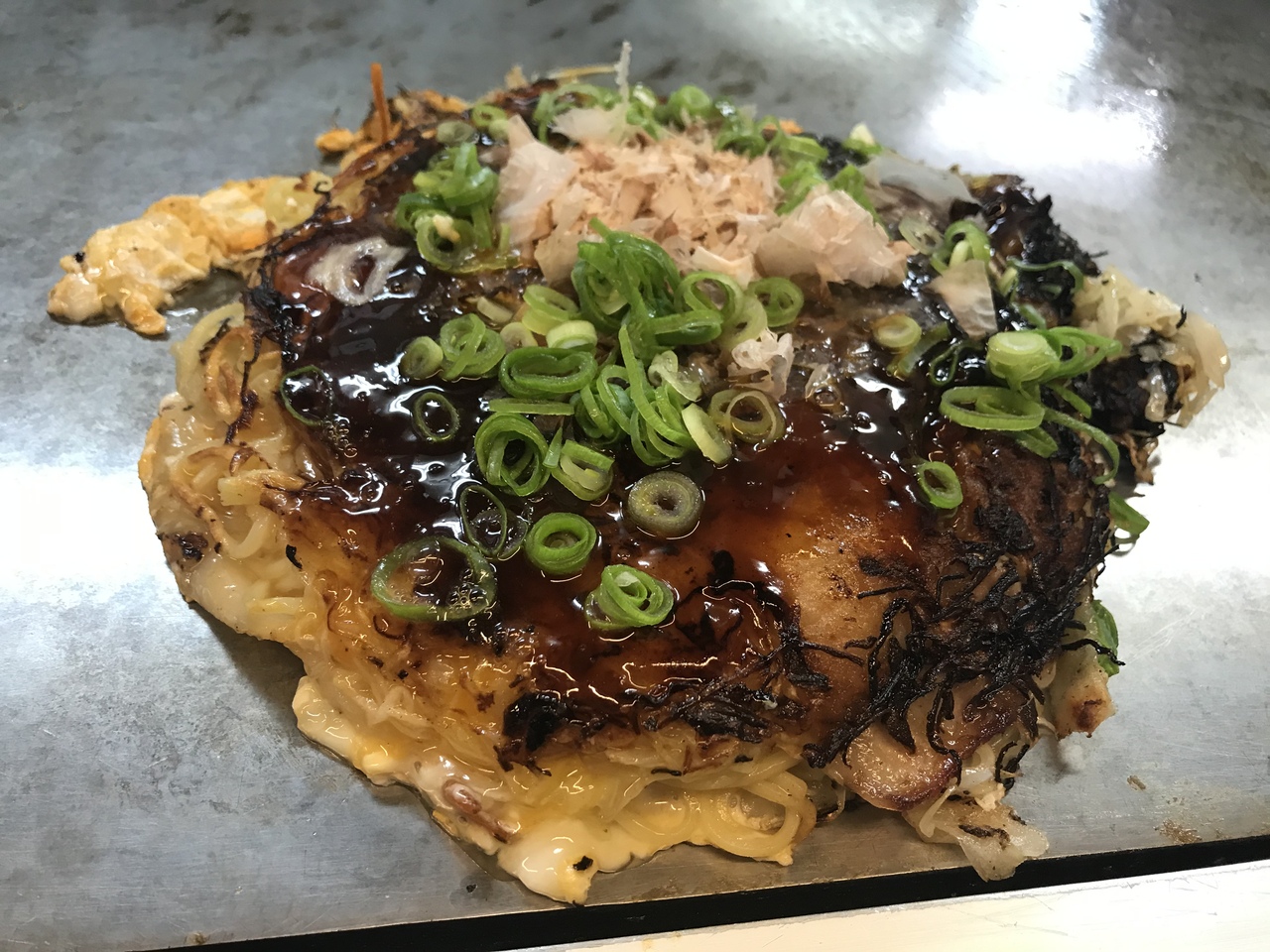 ここのお好み焼き、そばがパリパリ系の元祖(諸説あると思われるが)の店だそうで、麺、キャベツ、生地の順で出てくるので、焼きそばの様に見える。