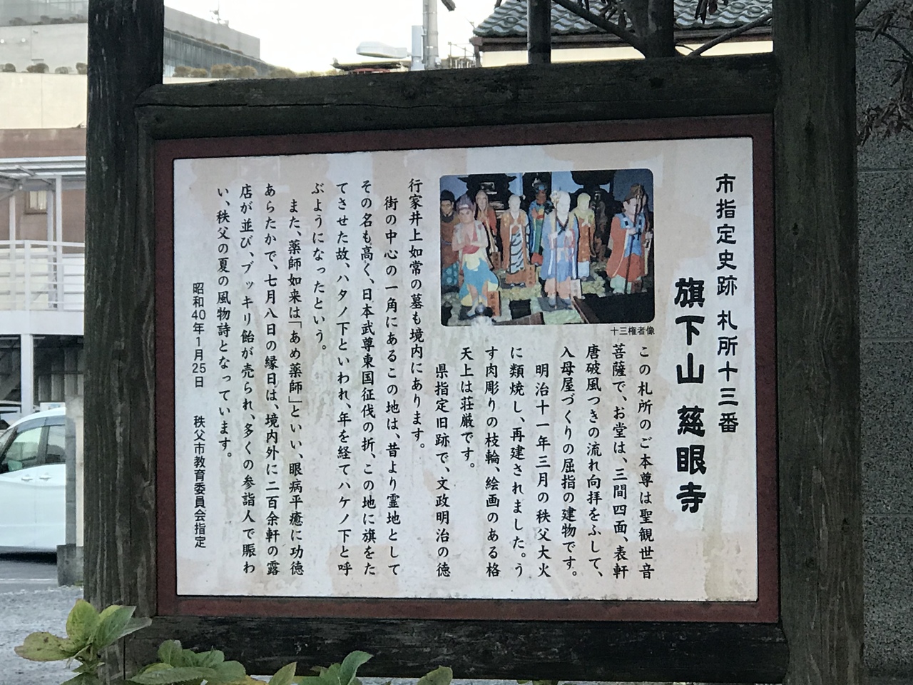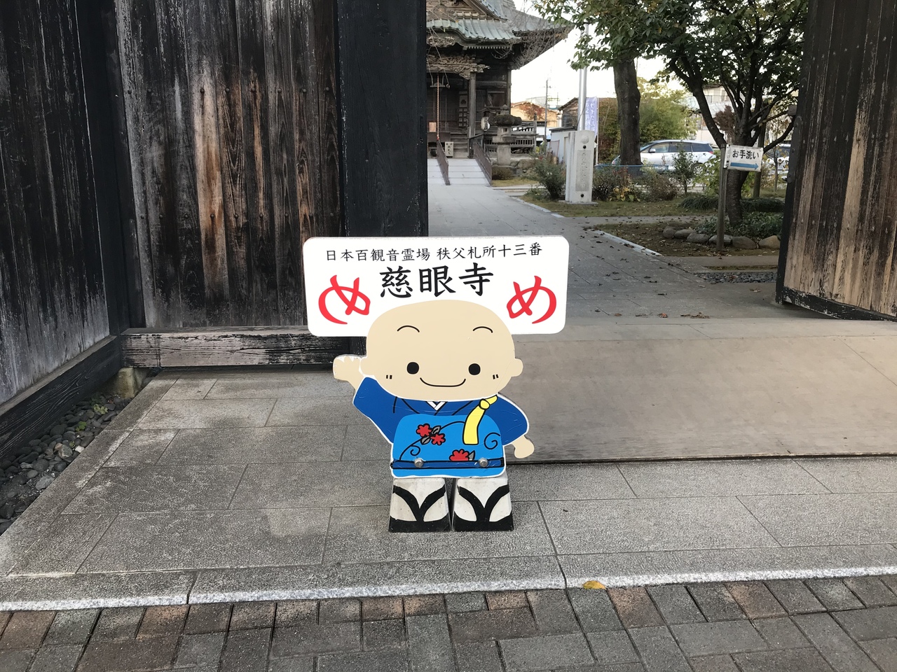 秩父鉄道御花畑駅からすぐ、西武秩父駅からも5分ほどのところにあります。お寺の前には可愛らしい看板でお出迎えしてくれる。
