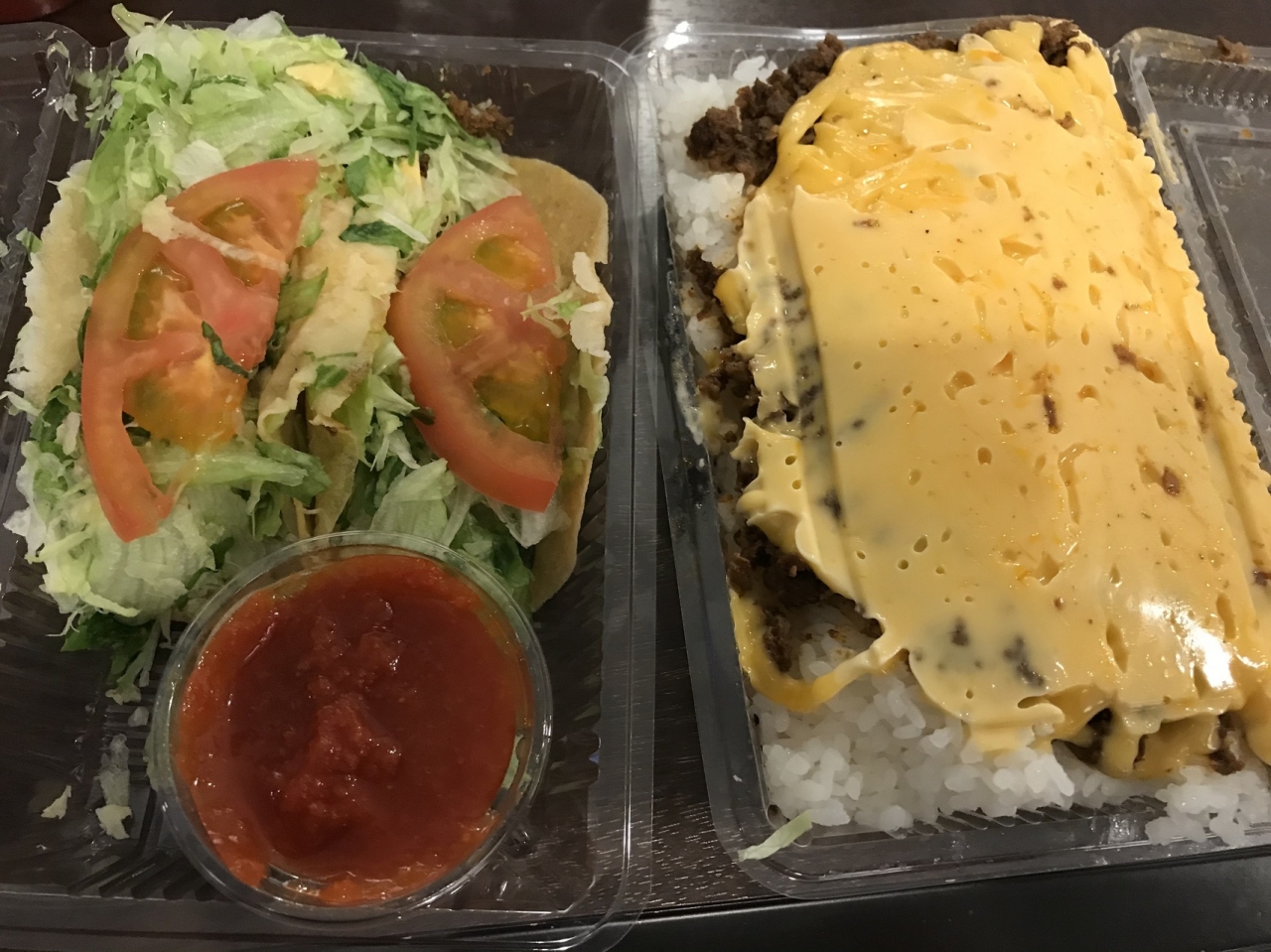 チーズたっぷりのタコライスとタコスをテイクアウトし、ホテルでいただきましたが、どちらもボリューム満点!タコライスはケチャップを追加で貰っておくと最後まで飽きないかな。