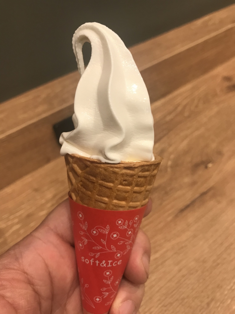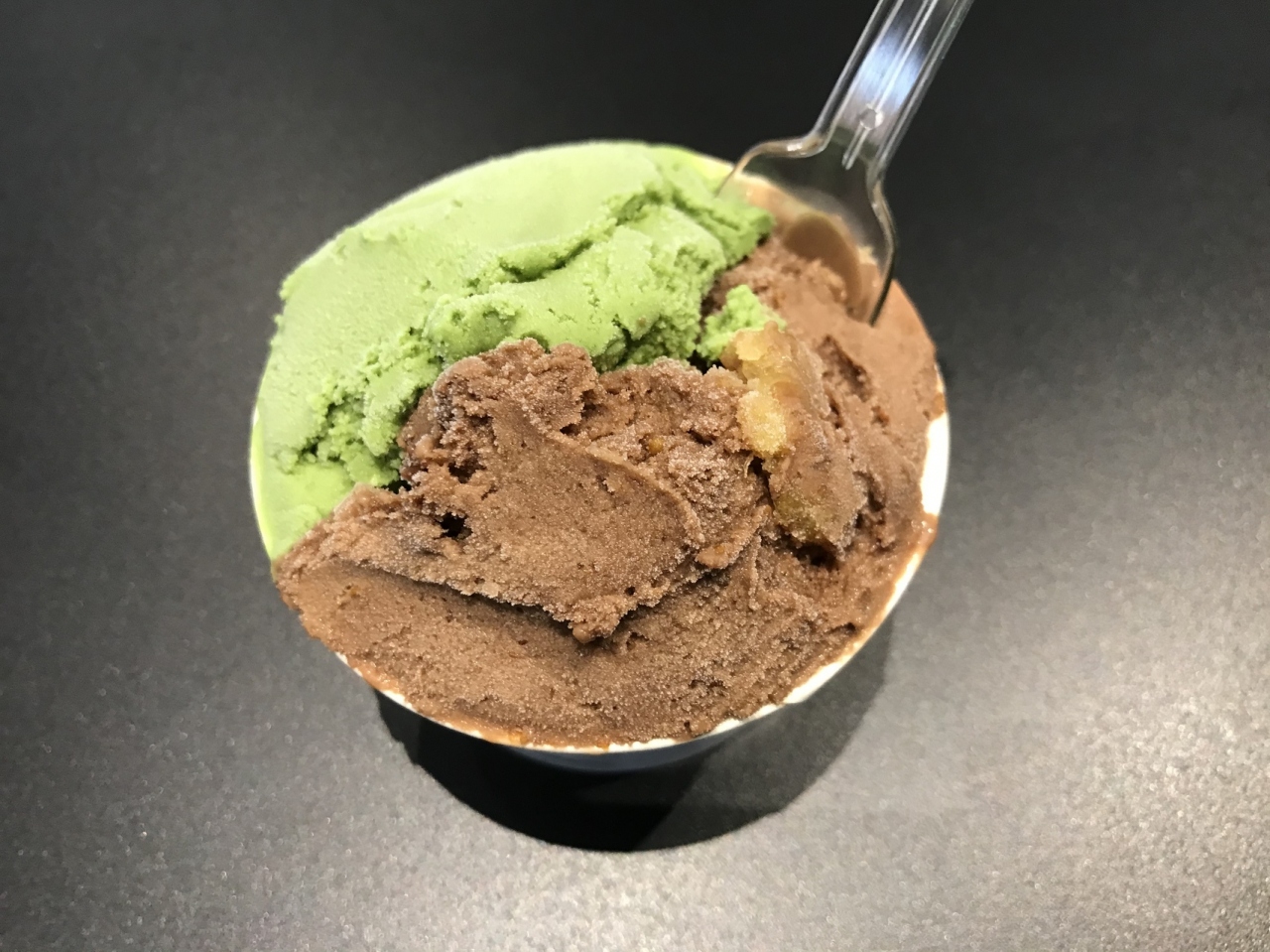 8月後半の暑い日だったので、冷たいジェラードを注文(これも350円と格安)。甘ったるくなく口の中でさっぱり溶ける感じ。鹿児島の知覧茶を使った抹茶ジェラードにしましたがお茶の甘みもほんのりと感じられました。
