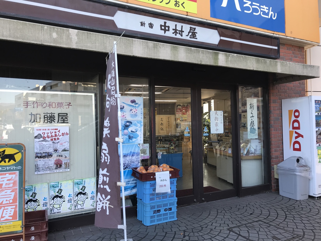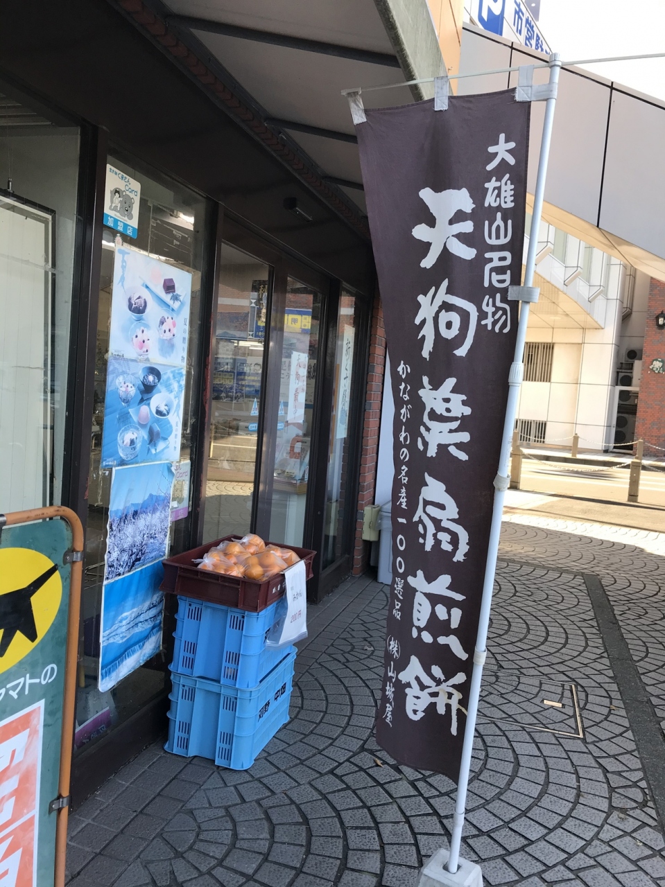 「新宿中村屋」の看板で営業しており、一見普通の和菓子屋さんだが、大雄山名物の「天狗葉扇煎餅」ののぼりがあって、思わず入店。