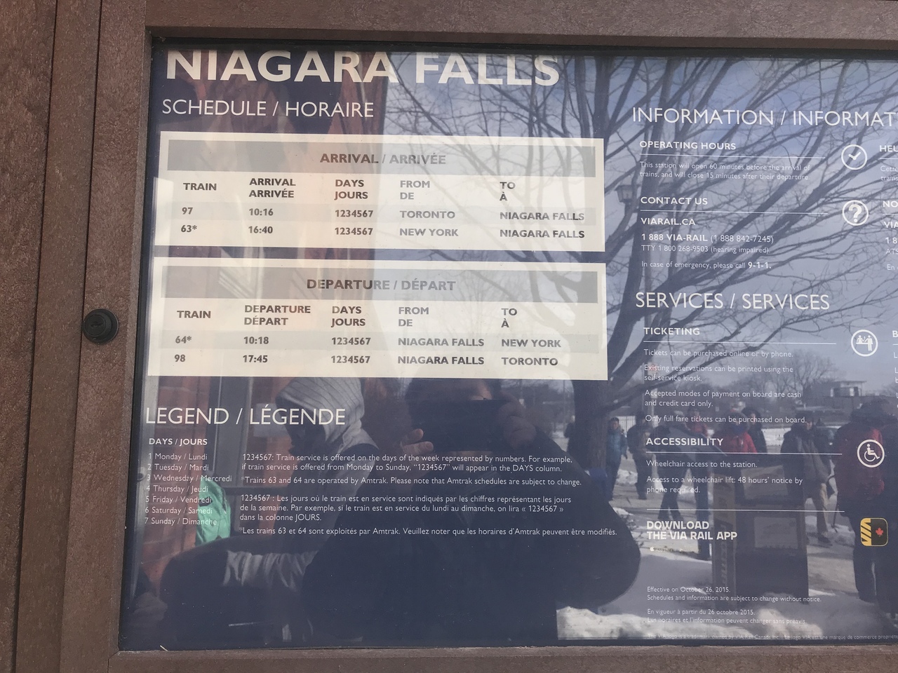 1日1本のトロントからのVIA鉄道で到着時に利用しましたが、比較的便利な時刻(トロントユニオン駅9:00頃発、ナイアガラフォールズ駅11:00頃着)の設定なのか、長いホームから改札へは結構な人の数であった。