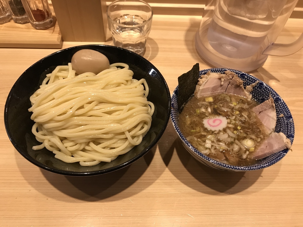 入る。つけ汁は豚骨に魚粉が入っているようでめちゃくちゃ濃厚。多めの葱が良いアクセントになっていて、極太麺によく合う感じ。