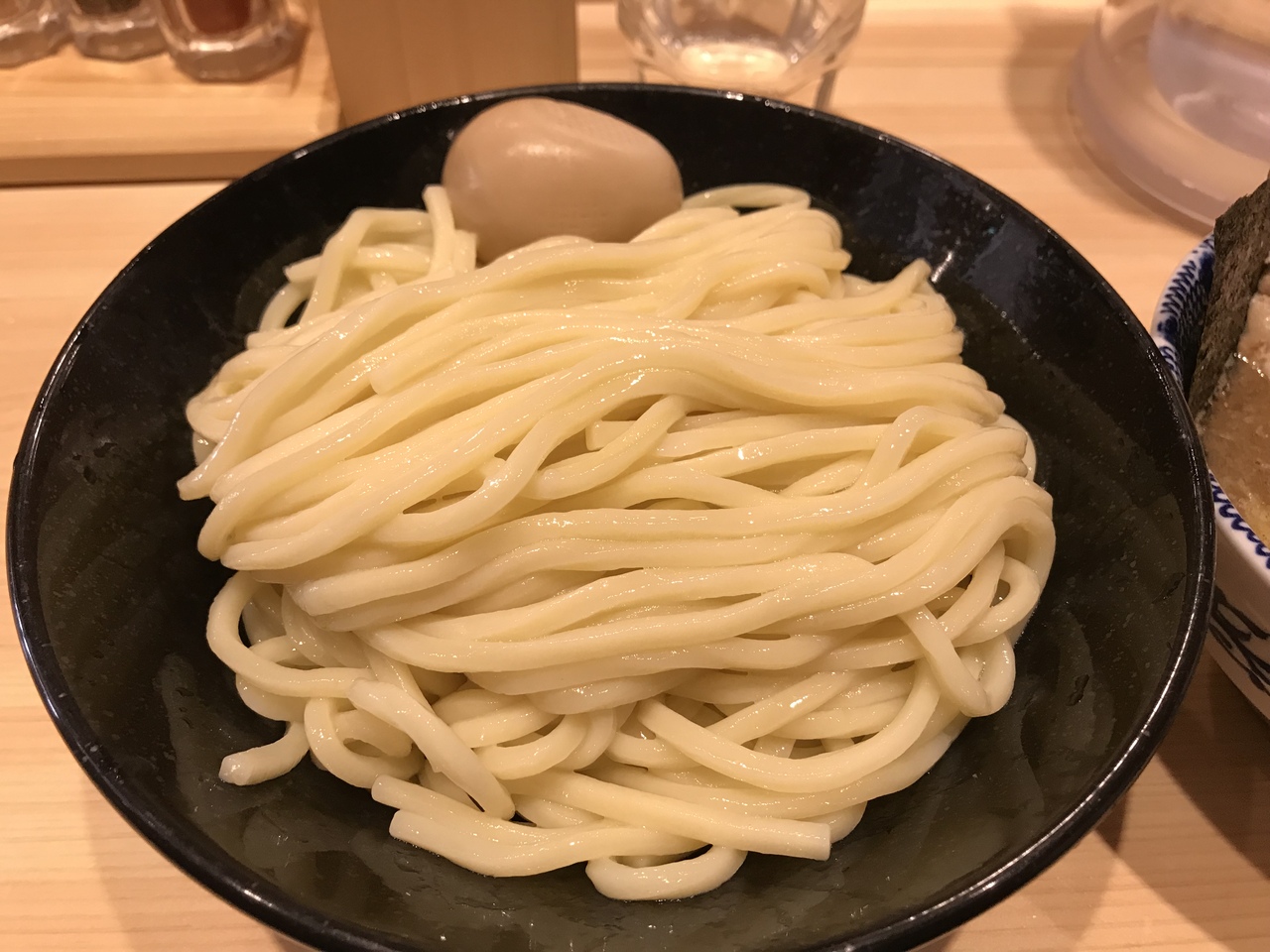 つけ麺チャーシューに味玉をプラス。麺は極太麺、もちもちの食感であるが、つるっと