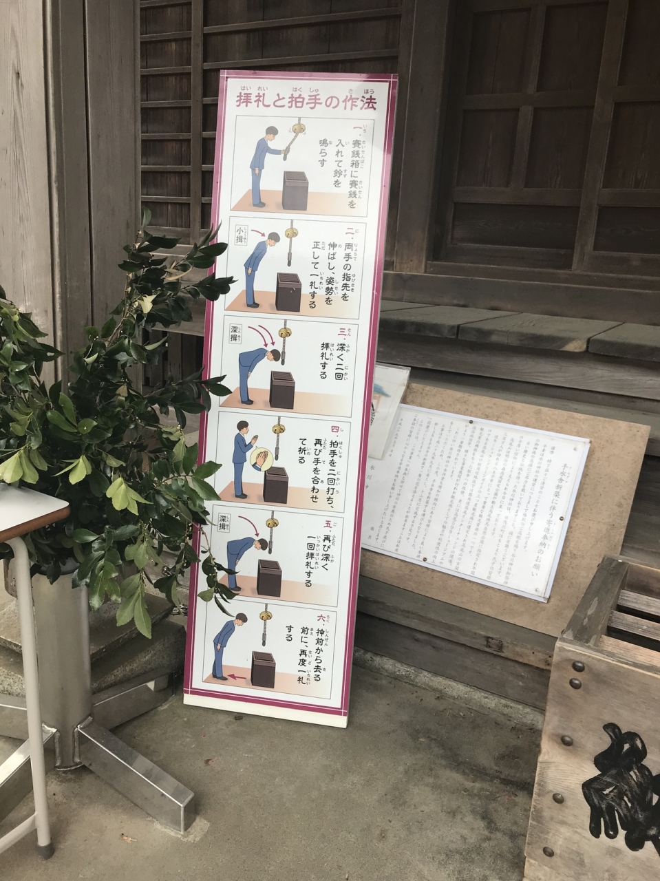 神社の手前には手水舎があり、そこで清めてから大鳥居をくぐり、拝殿する流れ。手水舎には作法がイラストで描いてありわかりやすい。