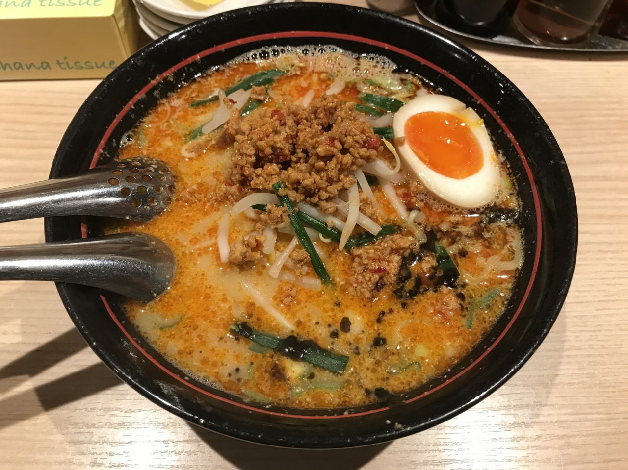 坦々麺には汁ありと汁無しがあるが、今回は汁ありに。辛さはオプションで追加可能。麺大盛に加え替え玉があるのが九州らしい。