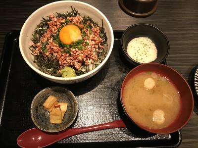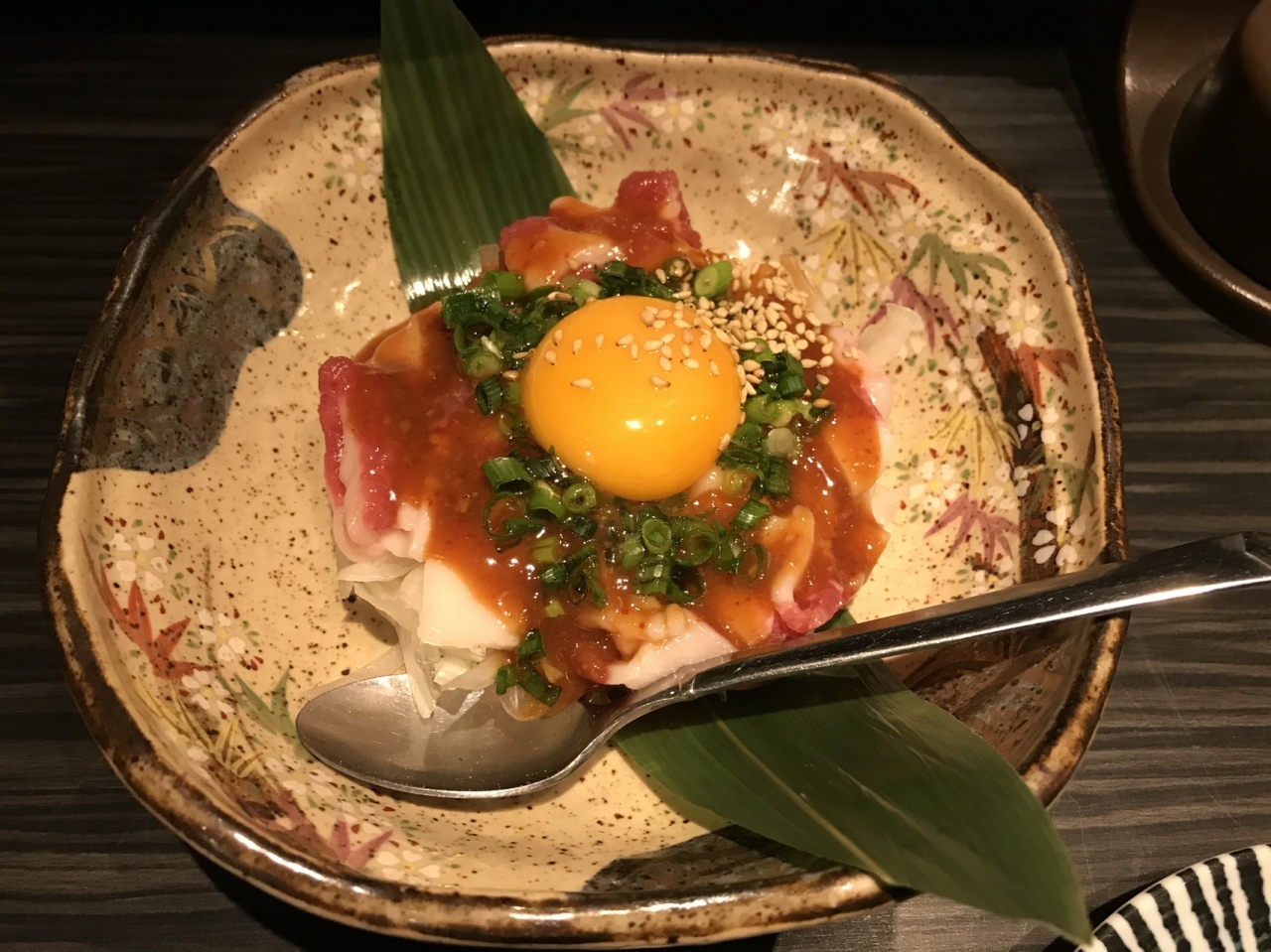 締めに馬丼を注文。温かいご飯の上に冷たい馬肉のミンチ、卵黄、海苔がのっていて、ぐちゃぐちゃに混ぜてから食べるとなんとも言えない味。途中でとろろを追加すると味変してまた美味い。