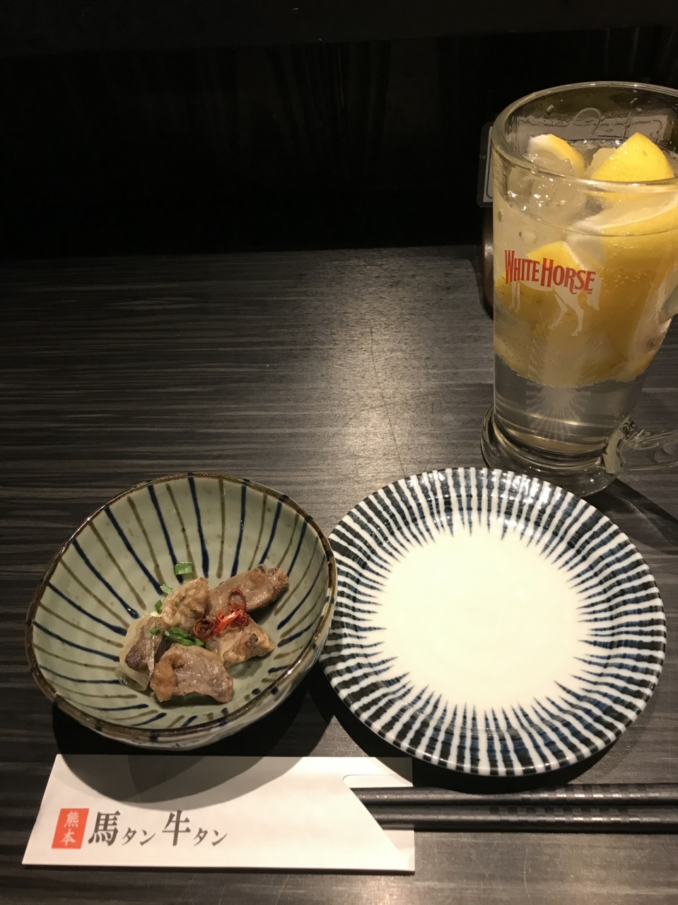 GO TOイートキャンペーンで、馬タンの刺身とお通し(馬肉を軽く炊いたもの)にアルコール2杯で1,000円と言う激安セットをHPで見つけたので、まずはそれと馬肉ユッケでまずは1杯。馬タンの刺身は臭みが無く、柔らかい。馬肉ユッケは牛ユッケに劣らない味(今日本では食べられ無いので想像だが)。