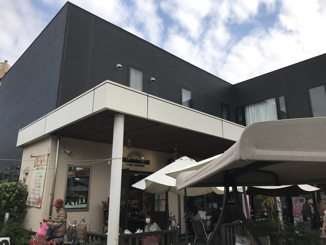 熊本市電の終点健軍町電停を降り左側を歩くと朝なのにめちゃくちゃ繁盛している店を発見。ミスタードーナツと同じ敷地にあるパン屋さんで、テラスあり。外には塩パンの焼き時間が表示されていて、塩パンが人気らしい。