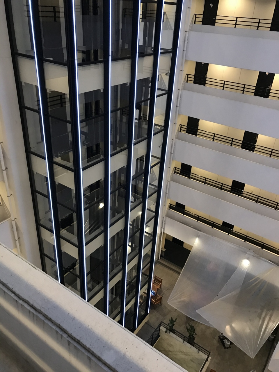 建物は真四角の吹き抜け(雨の日どうなるのか少々不安)、最上階には大浴場(露天風呂)、フロント横にはウエルカムドリンクがあるなど、一応リゾート気分が感じられる。