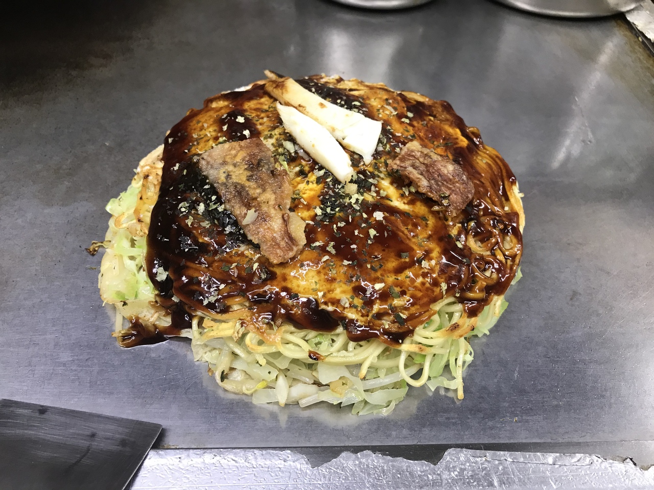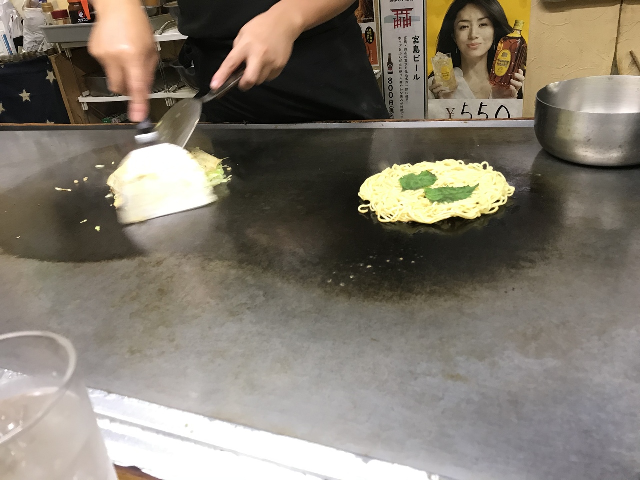 注文すると鉄板の上で手際よく作り始める。こちらの店はお好み焼きをへらで押さえつけず、蒸し焼きにする方法でつくるのだそう。なのでふわっとした感じがした。またそば(麺)はしっかり焼いてからお好み焼きに加えていて、そのせいなのかそばがパリっとした感じがあってなんとも言えない。こういう感じのお好み焼きは初めて(感動!)平和大通り近辺に宿泊した際はまた行こうと思います。- 旅行時期