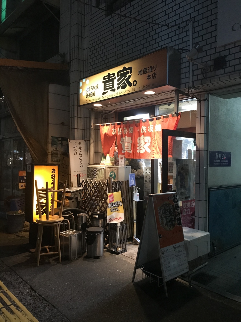 こじんまりとした店内、カウンターだけの店。いわゆる昔からのお好み焼き屋さんの雰囲気。人気店のようで壁には有名人のサインが一杯(良し悪しあるが…)
