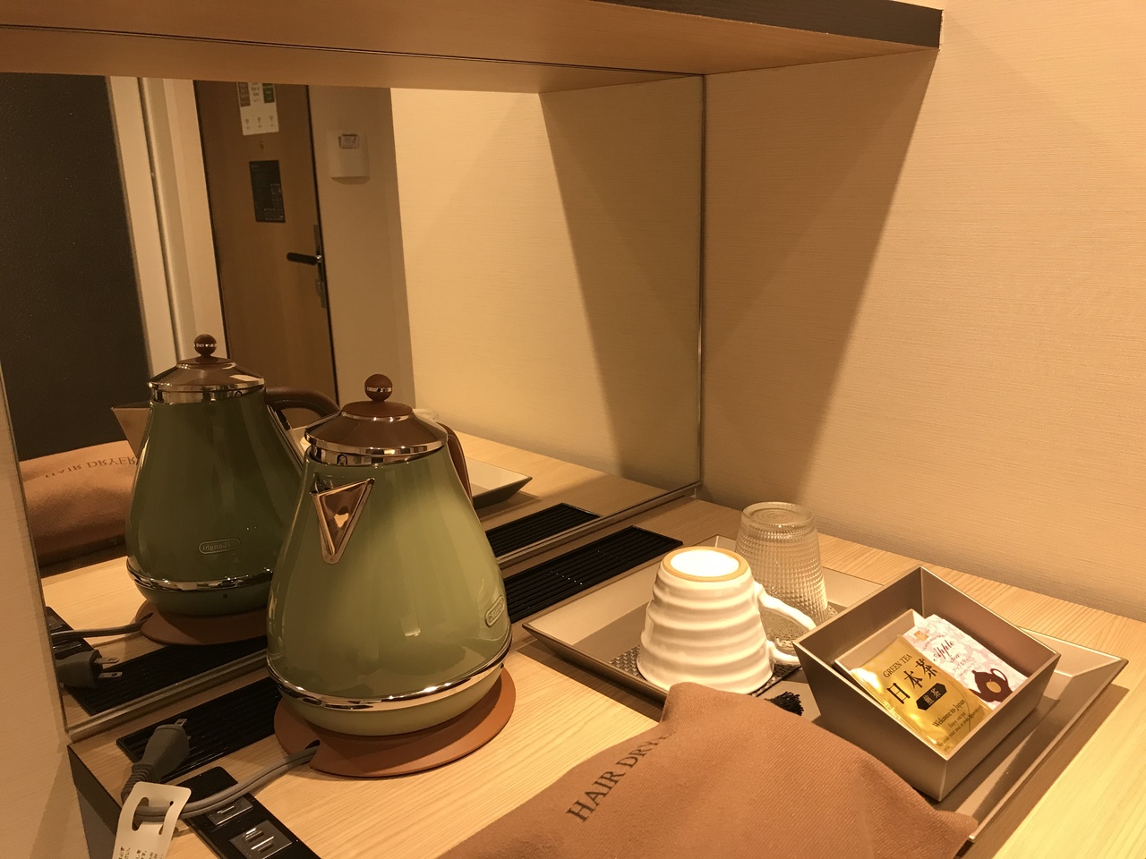 シングルルームに宿泊。ベッドは普通サイズだが、枕とは別にクッションが付いているのが良い。また、デロンギ製の洒落た電気ポットがあったり、セーフティボックスが完備されているのも嬉しい。