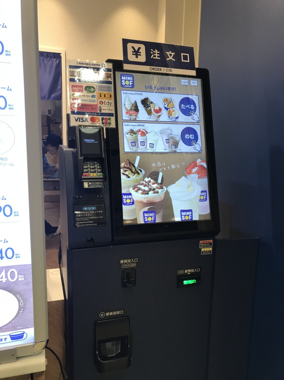 精算はすべて自動。現金、WAON、Suicaの他クレジットカードも利用可能(ただしJCBは不可)チケットを買うと、チケットを渡す前に厨房?で係員が作ってくれる。