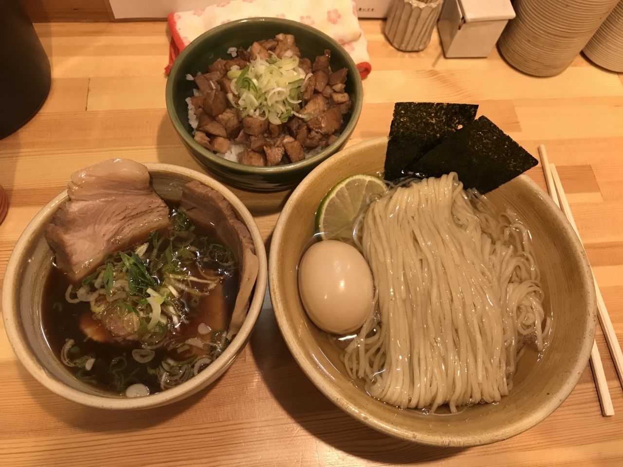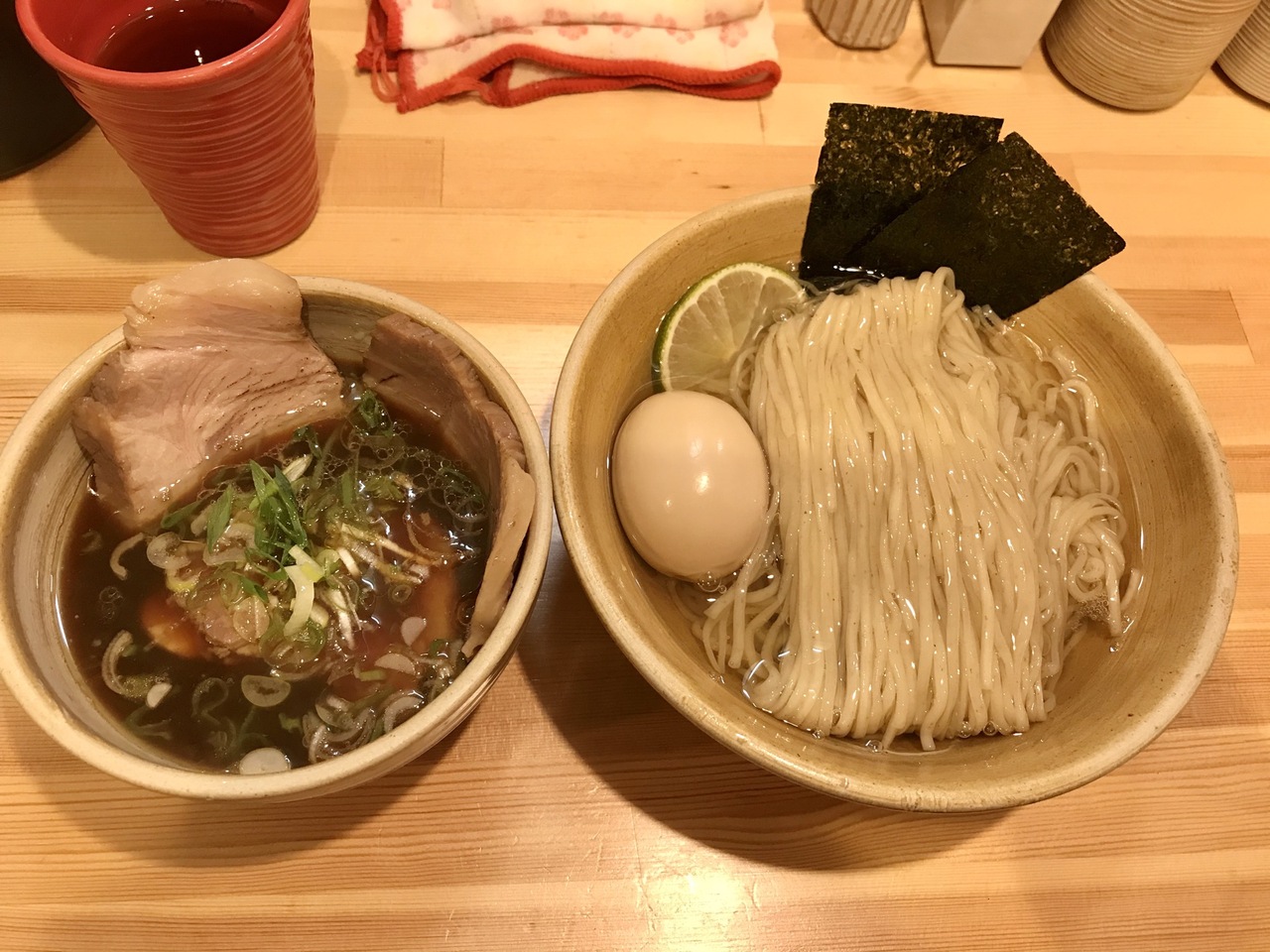 鰹昆布出汁のつけ麺はとにかく麺が美味しい。麺はひや盛が基本(あつ盛もお願い可能だが、おすすめしないとのこと)。小麦のふすまも使っているそうなのだが、ふすまのボソボソ感は全く無く、むしろ喉で味わえる麺。つけ麺でここまで麺が美味しいと感じたことは初めて。麺の入った丼には鰹出汁と柑橘類(かぼす)の輪切りが入っていて、爽やか。最後まで味を楽しめる。またスープ割では無くこれを最後に割るのも良い。