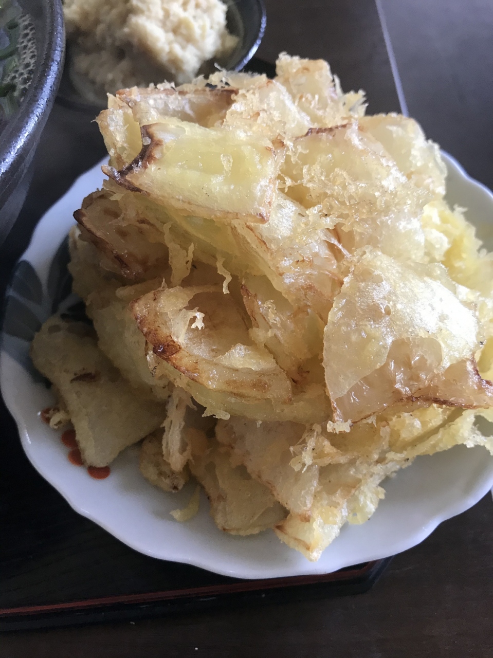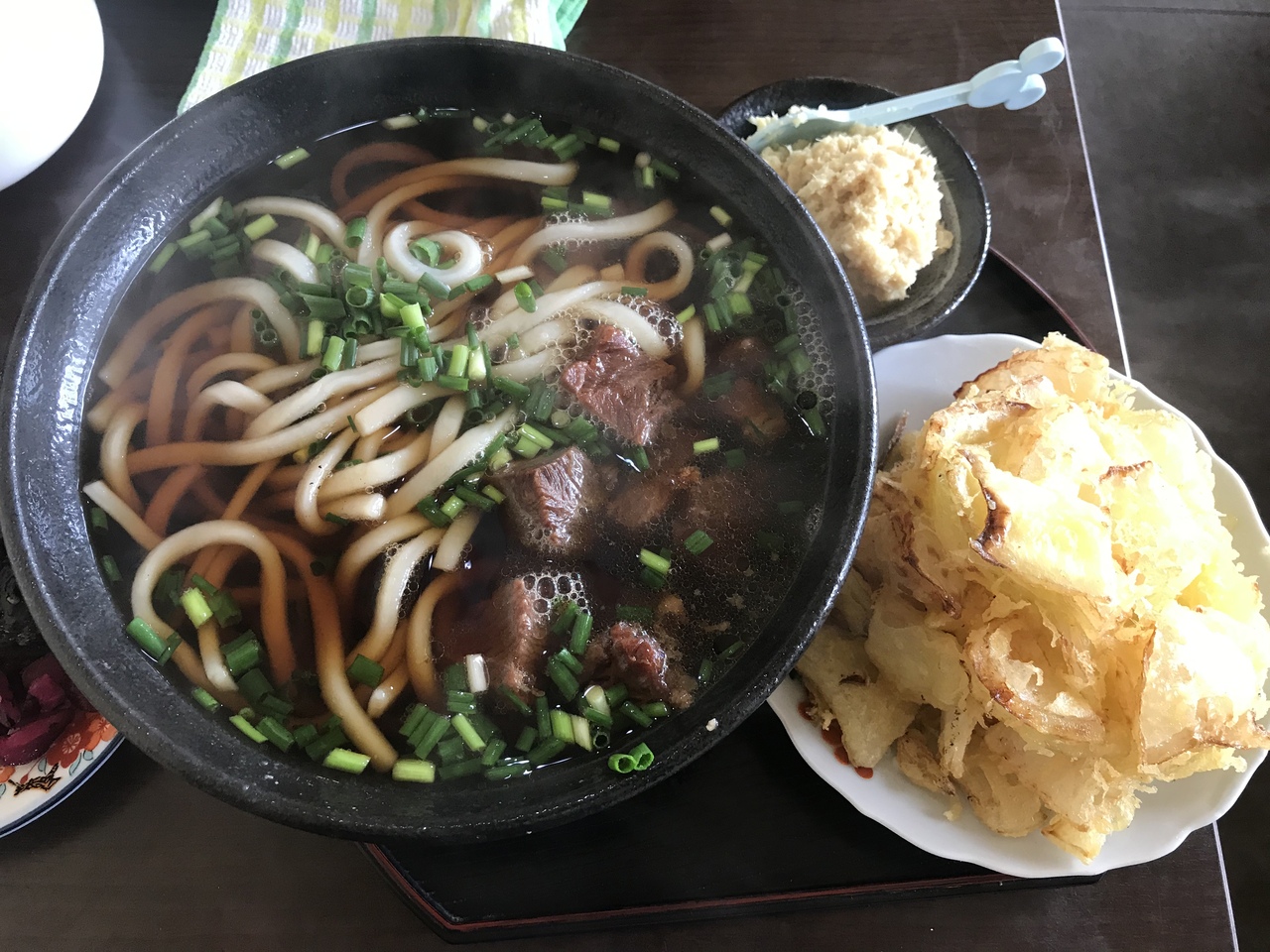 うどんと天ぷらが到着。うどんのスープは黒くて甘いが、くどく無く飲み干せる味。また、牛すじはトロトロしているが、余計な脂分を除いているようで、食べやすい。後で胃にもたれない。うどんも柔らかくて美味しい。また、玉ねぎの天ぷらは玉ねぎだらけのかき揚げ。うどんに入れても良いし、ソースで食べても良い。玉ねぎの甘さがしっかりあってこれにもハマってしまった。
