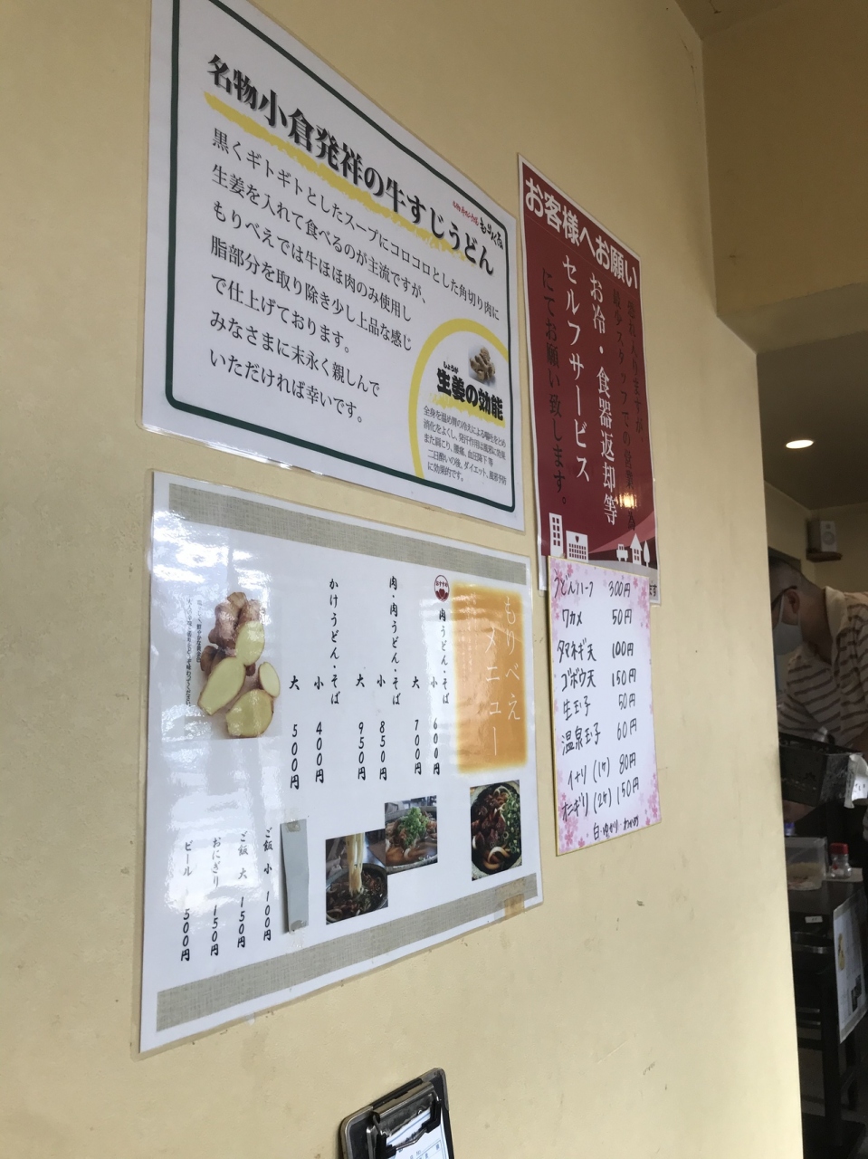 小倉発祥の牛すじうどんとおすすめと聞いた玉ねぎの天ぷらを注文。お店の真ん中には惣菜が数種類置いてあって食べ放題。切り干し大根や豆の煮物など家庭的な味が味わえる。
