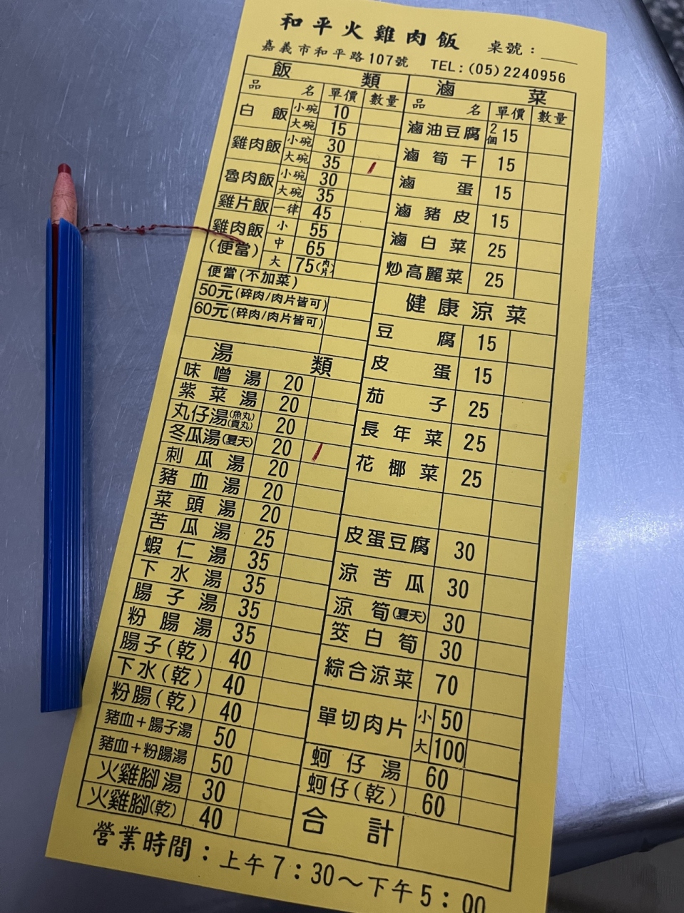 入店しメニューにチェックを入れる。鶏肉飯はほぐし身の雞肉飯と切り身肉の雞片飯があるのだが、メジャーな鶏肉飯を注文。また湯(スープ)の種類が多い。砂肝と生姜でつくる下水湯(シャーシュウェイタン)もあるのだが、今回は夏の定番でもある冬瓜湯(冬瓜の味噌汁)を注文。50元少々(250円程度)の価格の安さにびっくり。