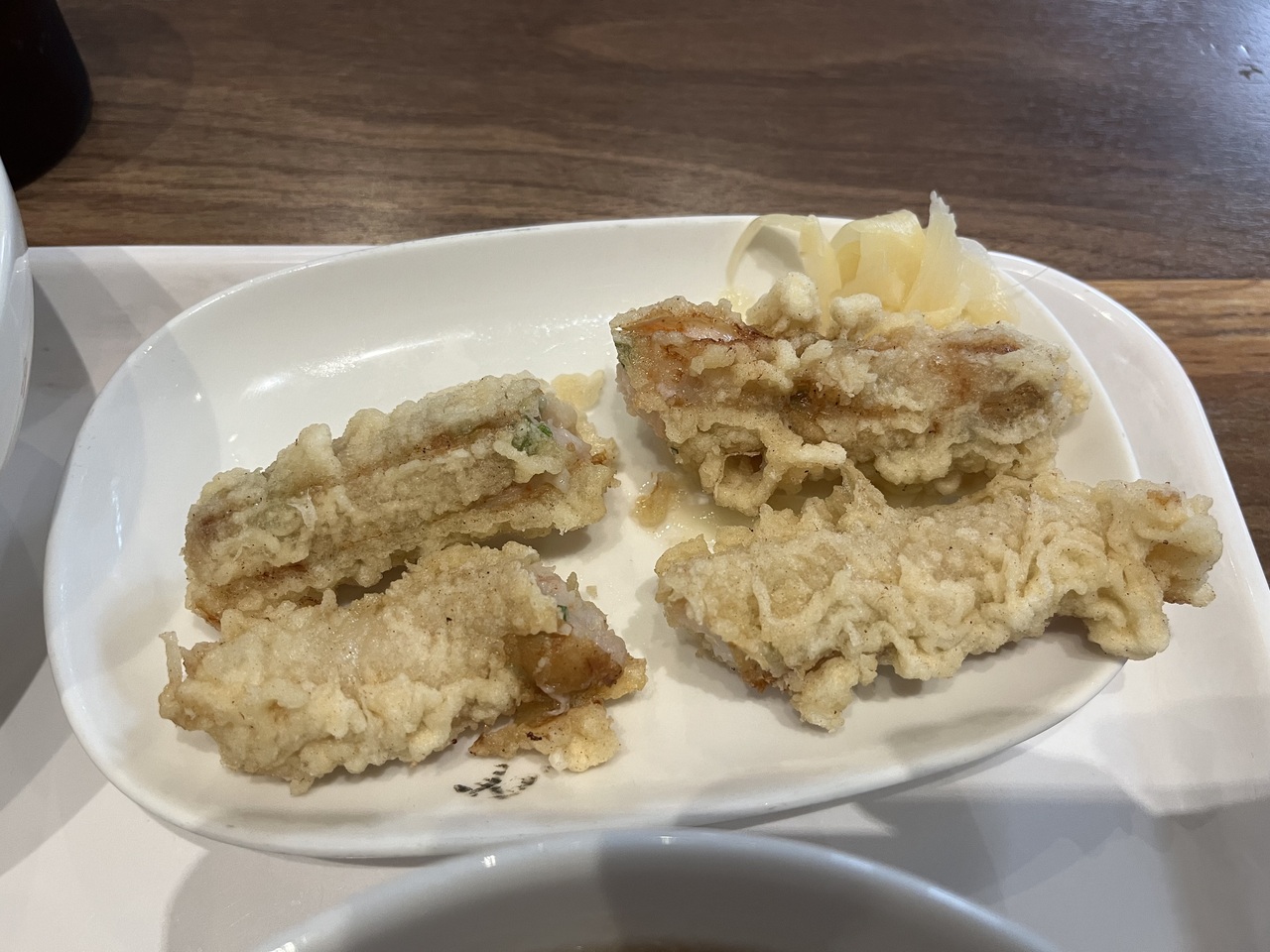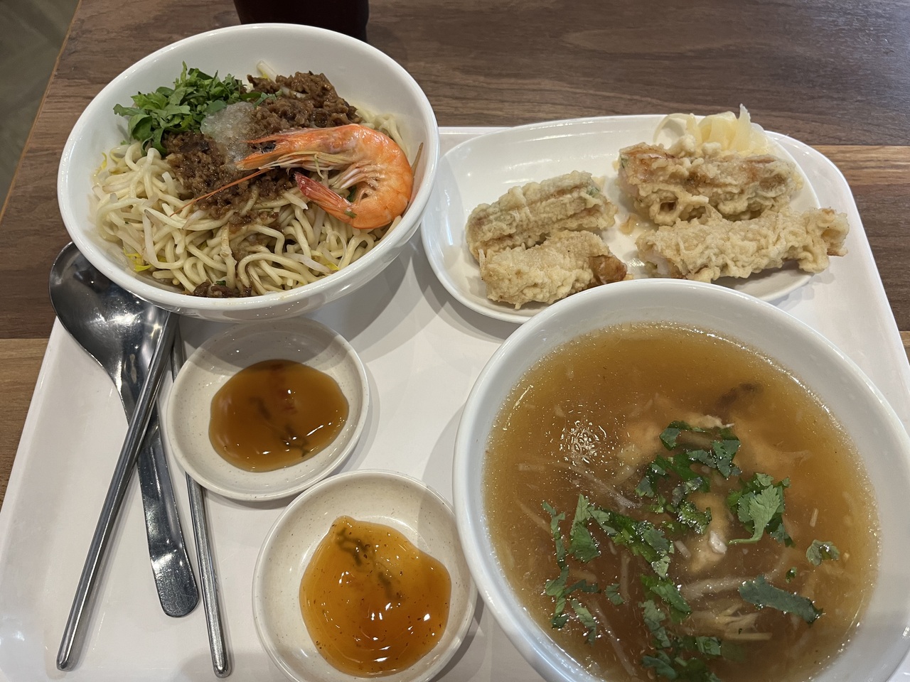 台南発祥の担仔麺(ダンザイミェン)とのセットを注文。お店の看板である炸蝦捲(エビ巻き)はサクサクの衣の中にプリプリのエビが入っている。スイートチリソース、わさびなどを付けて良い。