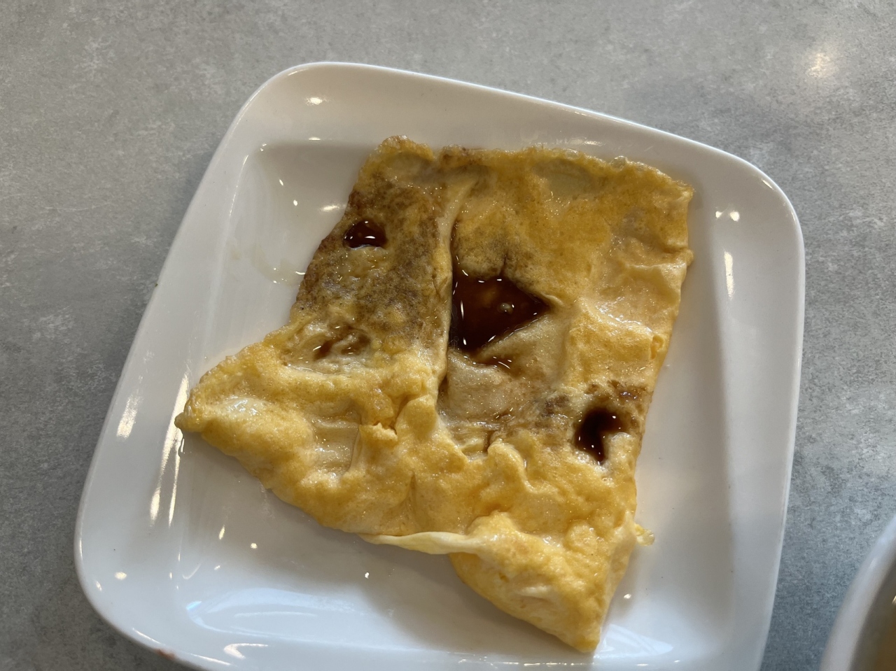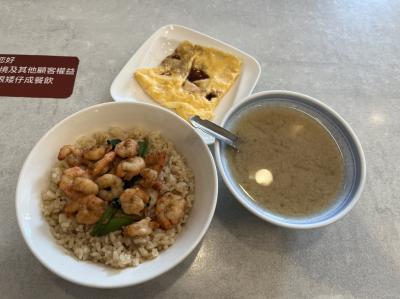蝦仁飯(えび飯)と香煎鴨蛋(アヒルの玉子焼)に味噌汁を注文。香煎鴨蛋は目玉焼(半熟または固焼き)、散蛋(スクランブルエッグよりも玉子焼きに近い)を選べる。
