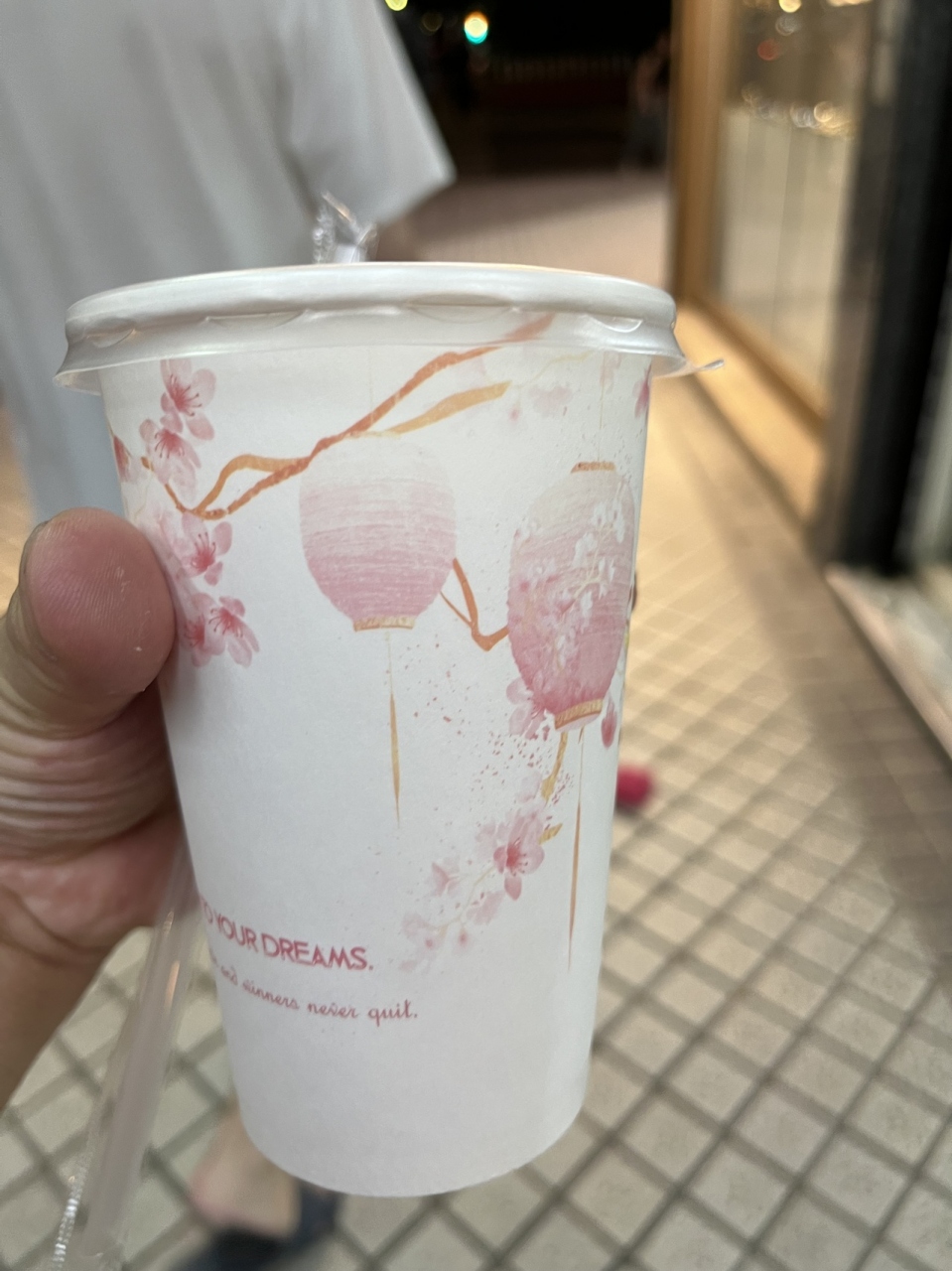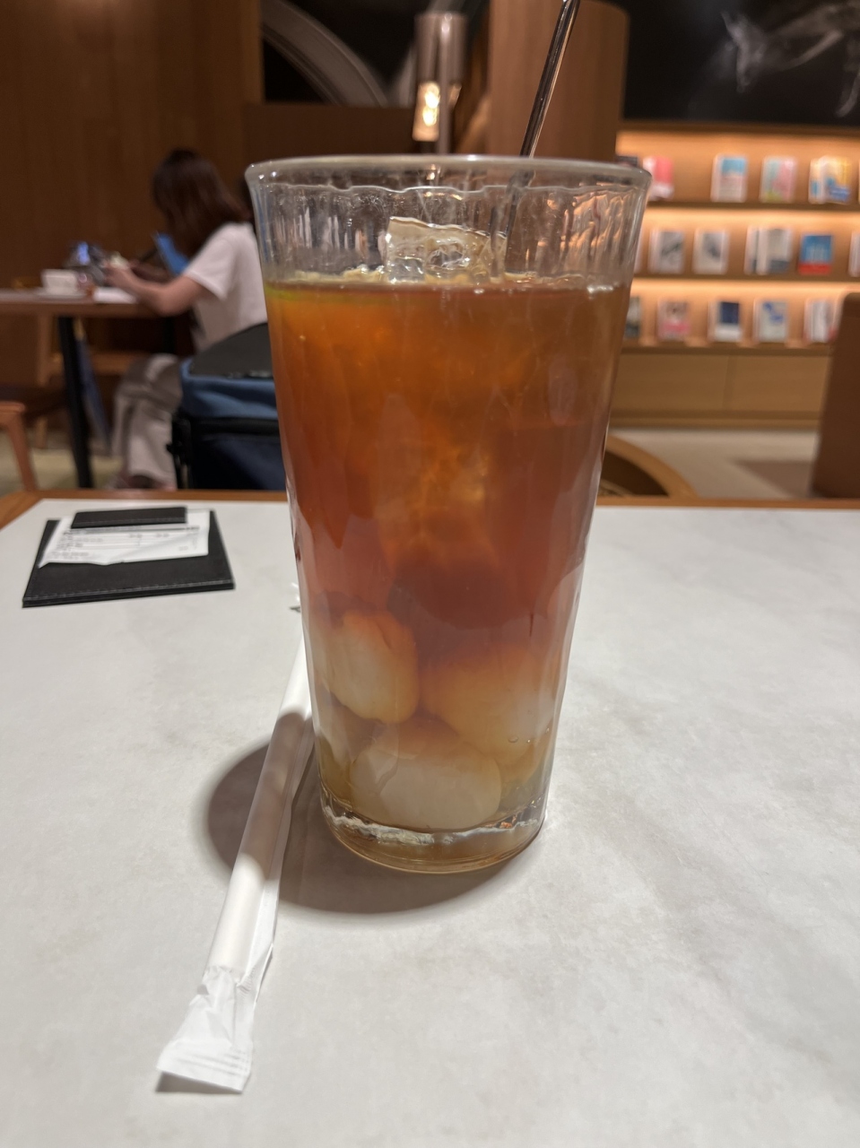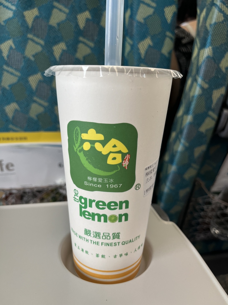以前注文したことのあるヤクルト緑茶は販売終了とのことで、スタッフおすすめのオレンジグリーンティーを微糖(通常の3割程度)、去冰(氷無し)で注文。お茶の香り、苦味は残っていてオレンジの甘さがそれらをカバーしている。去冰にしたので常温では無く、また氷で薄くなる事も無い。おすすめ。- 旅行時期