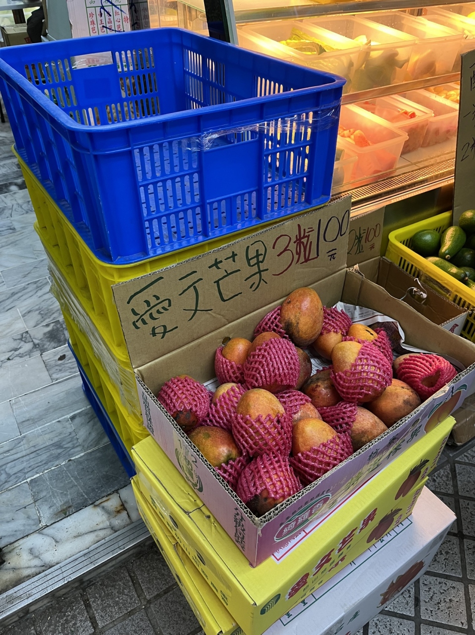お店の前には冷蔵ケースにはカットしたフルーツや野菜、日本では高価な愛分芒果(マンゴー)も。その場でジュースにしても美味しいし、、牛乳やヤクルトなどと混ぜたドリンクにしもしてくれる。またカットフルーツをそのまま持ち帰るのもOK。
