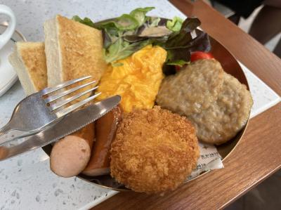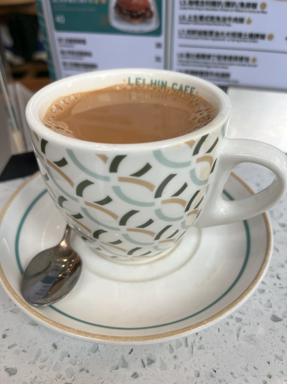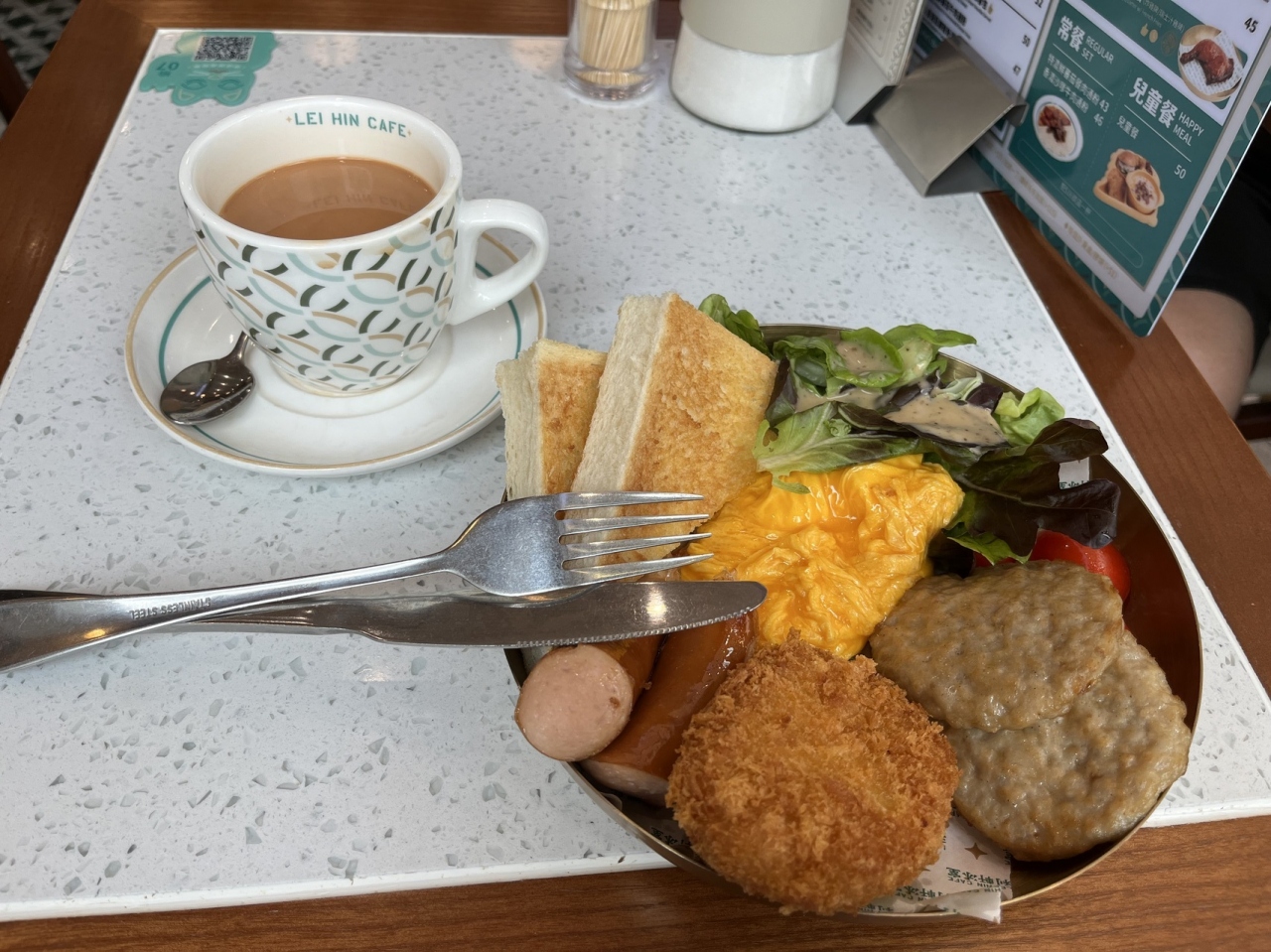 澳式全餐はトースト(何故か耳が無い→サンドイッチ用と共用なのか)、スクランブルエッグ、サラダ、ソーセージ(結構懐かしいタイプ)、ハンバーグ、コロッケがワンプレートに。マカオ風なのか突っ込みたくなるところもあるが、朝のメニューとしてはボリュームがあり、しかも好きなものが色々。ミルクティーは香港風の濃いめ。朝にはちょうど良い。