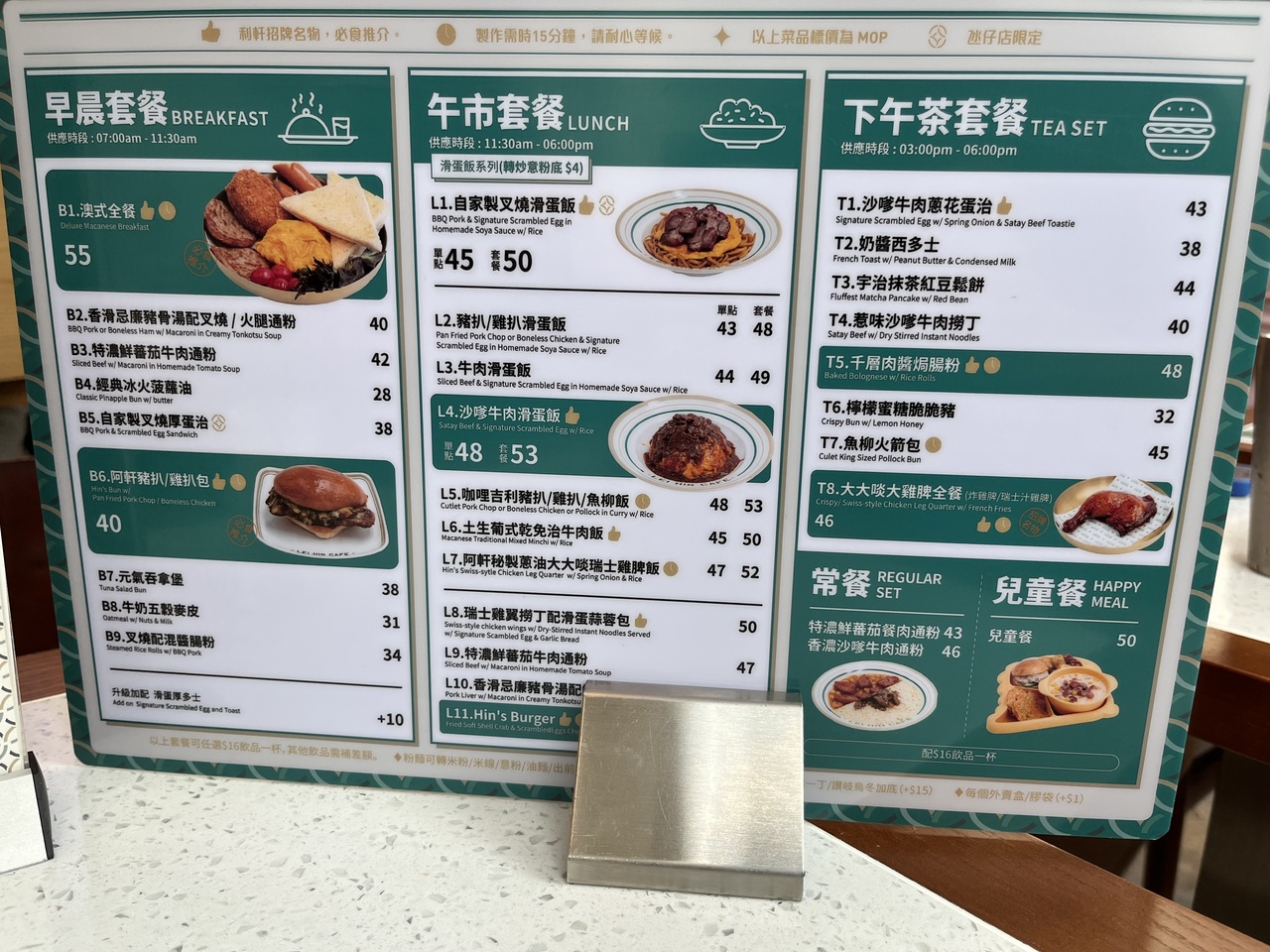 5分ほど待ち朝食(早餐)メニューを確認。ポークチョップサンド等もある中で澳式全餐(Deluxe Macaonese Breakfast)が気になる。55パタカ(1,100円程度)と茶餐廳では少々高めだがマカオ風ということで注文。飲品(ドリンク)は香港風のミルクティーを選択。