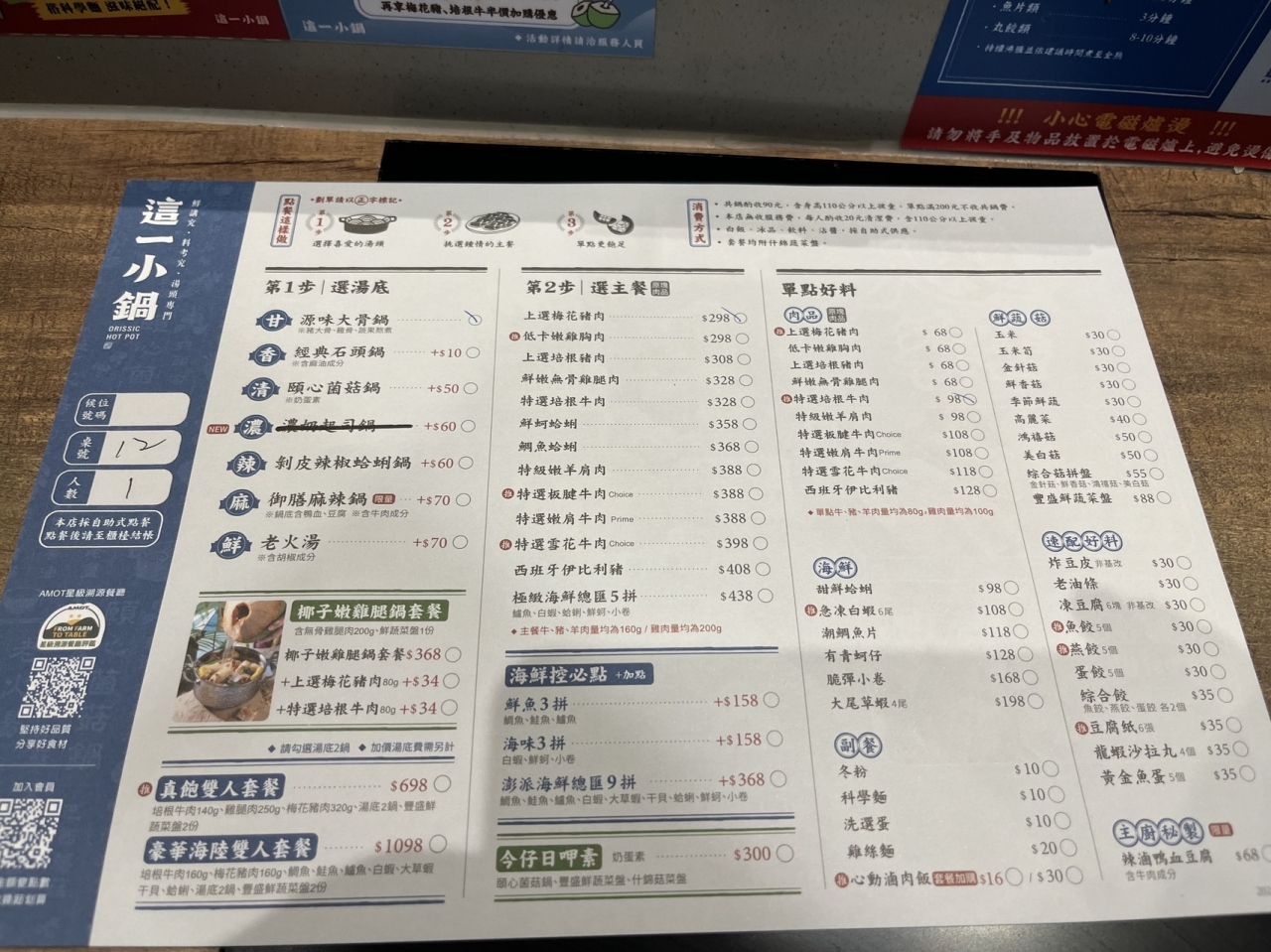 店内に入るとまずはメニューにチェック。個人的に麻辣鍋は苦手なので源味大骨鍋(オリジナル)のスープ、主餐(メインの具材)は上選梅花豚肉(上豚ロース)、に特選培根牛肉