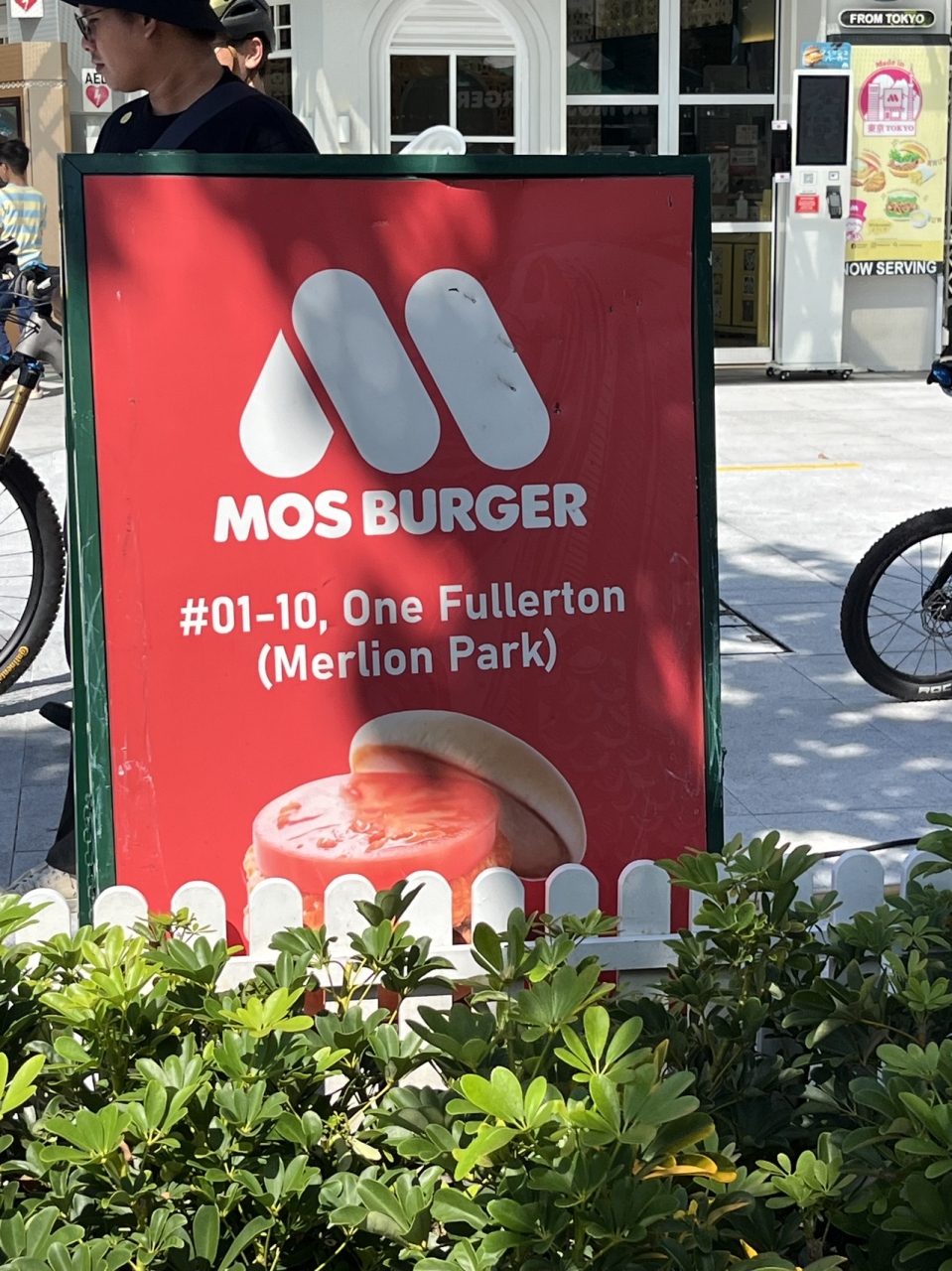 シンガポール国内のモスバーガーは50店舗以上あるが、マーライオンパーク内、ワン フラートンという細長いショッピングセンターの端にもある。スコールにならない限り屋外にも緑色のテントが設けられマーライオンを見ながら飲食することも可能(ただし暑い)。