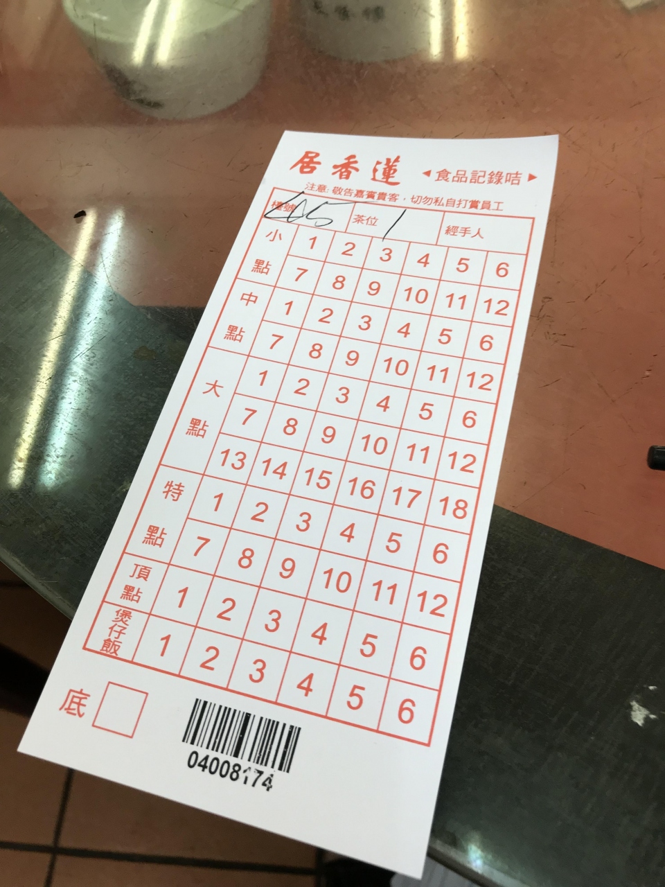 この店の特色はワゴン形式であるということ。ワゴンを止めて、蓋を開けて中身を確認して、会計表(伝票)にスタンプを押してもらい、好きな飲茶をいただくのはオーダー方式の飲茶とは雰囲気が違う。決して高級な店では無いが、現地の人に交じって食べるのも楽しい。