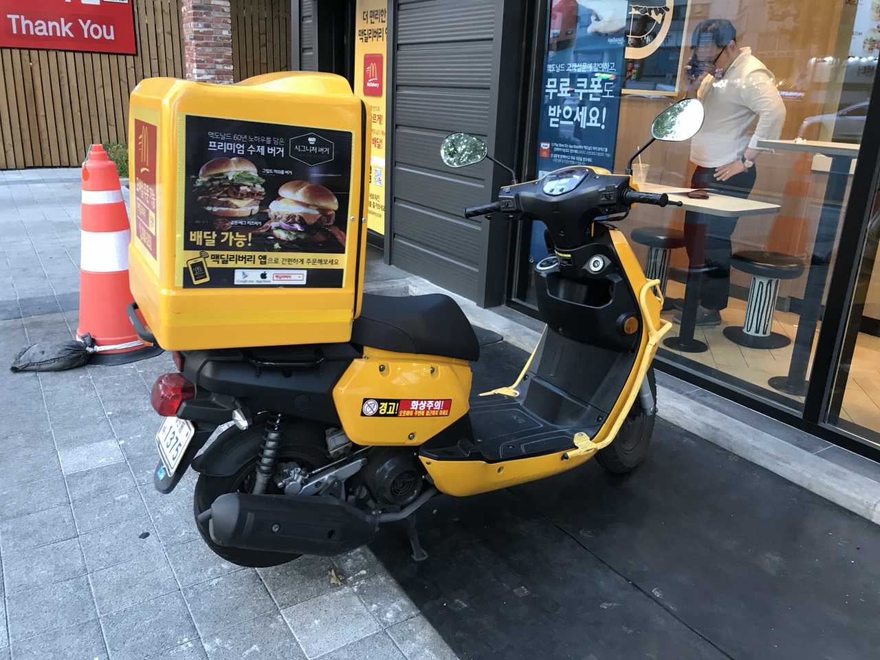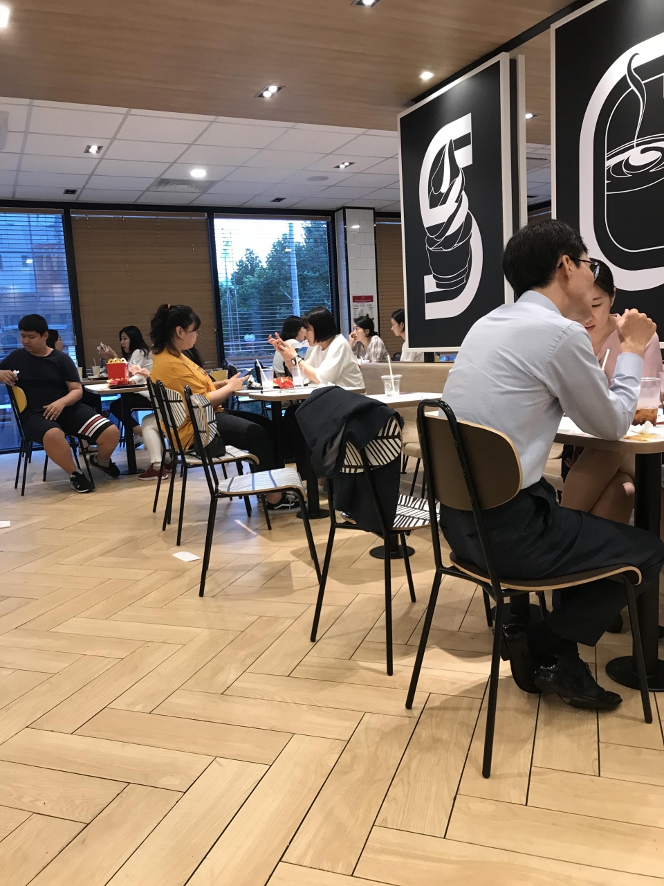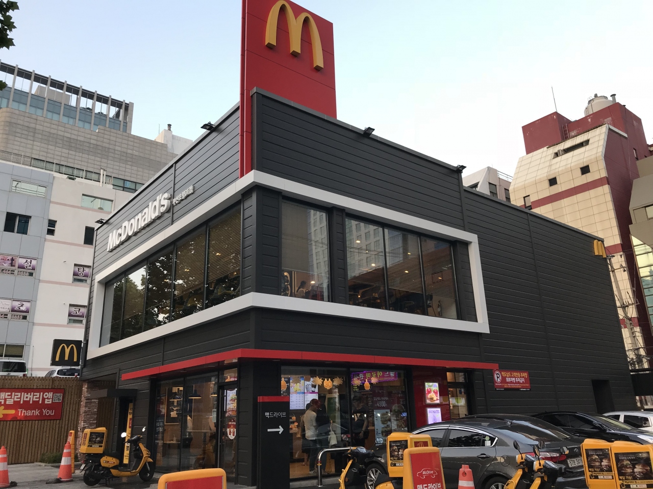 釜山駅から徒歩3分くらいの所にある店です。街中の店舗ですが、ビルのテナントではなく、2階はガラス張り。ドライブスルーもあり。