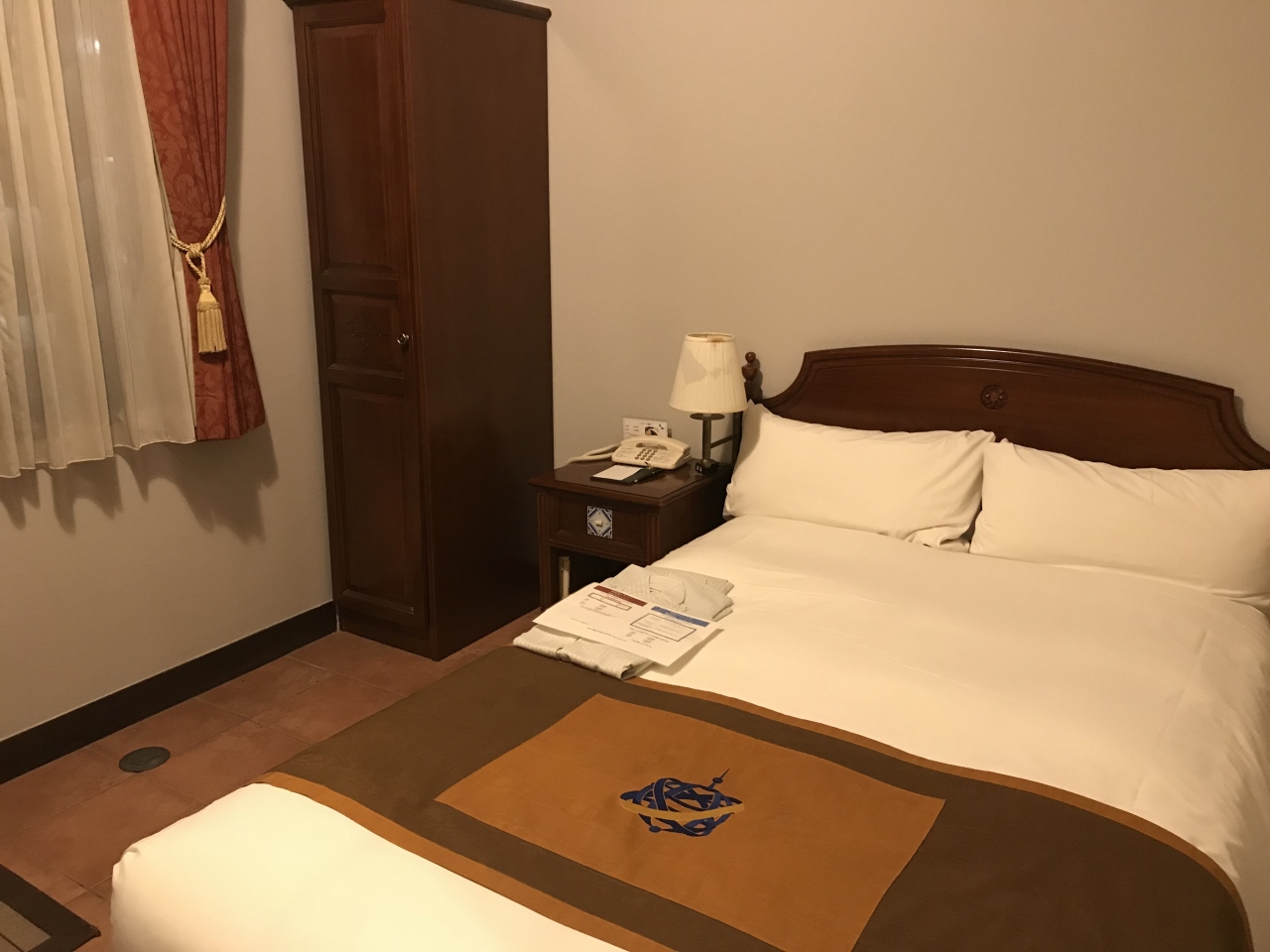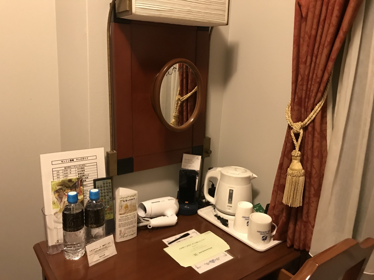 神戸や大阪のホテルモントレと同じく、外観は異国情緒があってお洒落。バスルームなどは若干古い感じもあるが、客室はアンティーク風な家具でまとめられており、落ち着く。男性一人の宿泊にはもったいない感もあるが(笑)。