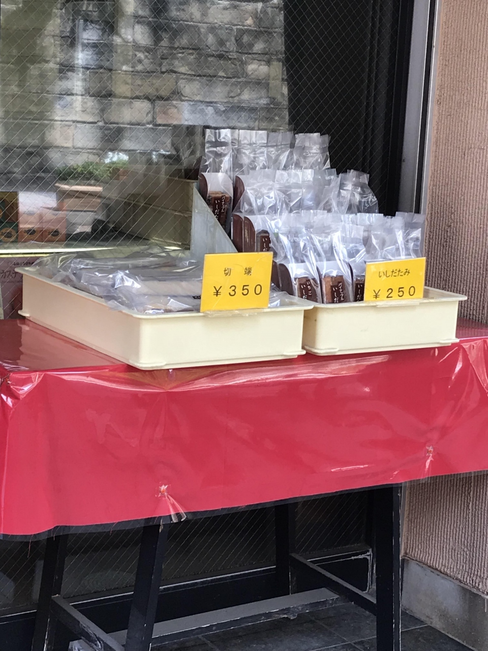 カステラはプレーン(蜂蜜味)、烏骨鶏カステラ、黒糖カステラがあって贈答、土産物用としておすすめなのだが、一人旅のお供に切れ端を購入。