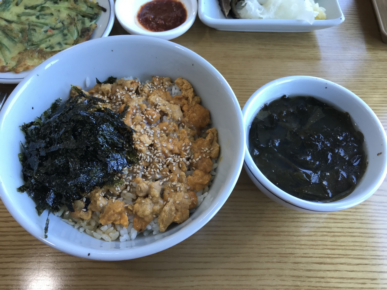 肝心のウニ混ぜご飯には胡麻油と韓国風醤油がまぶしてあり、何も加えない方が良い。ちなみに海苔の下にもうにがびっしり。ビビンバ文化の韓国なので、ぐちゃぐちゃに混ぜて食べるのがマナー。混ぜたウニご飯をおかずの海苔で包んで食べてもグッド!なお、ワカメスープは形は無いがウニの出汁がでている。