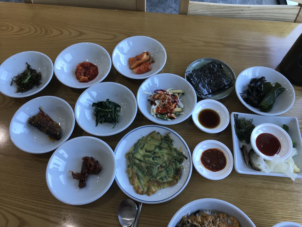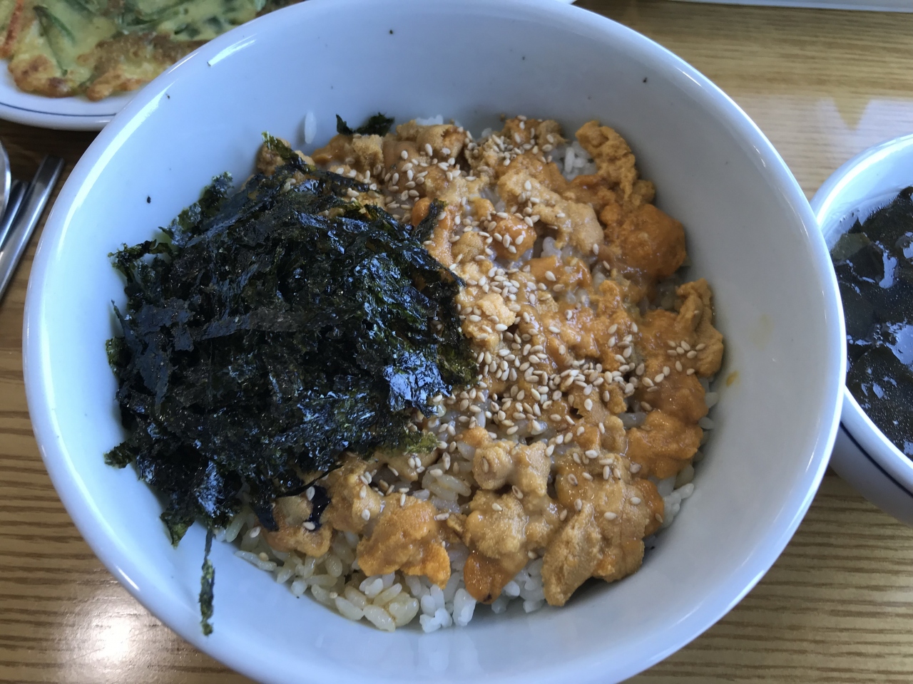 当然、ウニ混ぜご飯(大盛り)を注文。しばらくするとウニ混ぜご飯と11種類のおかずが到着。おかずも手を抜いていない。特にニラチジミと魚の炊いたものが美味しかった。また、ワカメ、昆布、白キクラゲなどをコチジャンソースに付けて食べる韓国風刺身もおススメ。