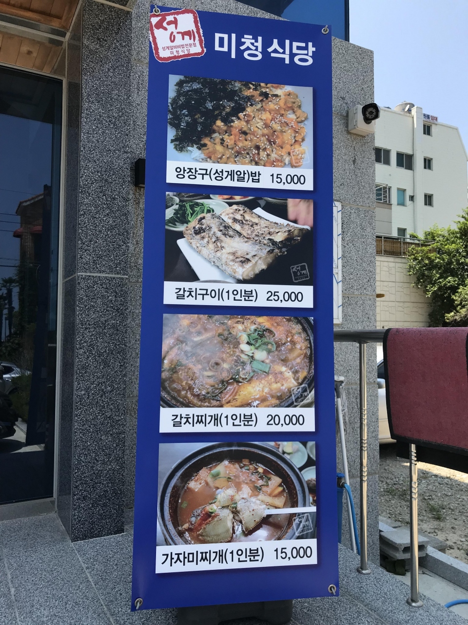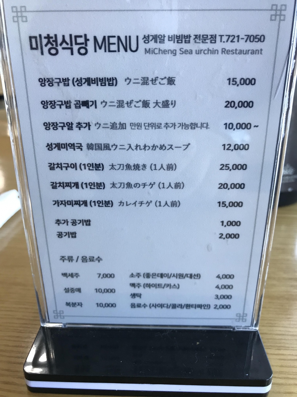 メニュー(日本語あり)はウニ混ぜご飯(15,000ウォン)、韓国風ウニ入りワカメスープ(12,000ウォン)、太刀魚焼き(25,000ウォン)太刀魚のチゲ(20,000ウォン)、カレイチゲ(15,000ウォン)など、ウニ混ぜご飯は大盛り(20,000ウォン)、ウニ追加(10,000ウォン)もOK。ウニは日本よりもめちゃくちゃリーズナブル!