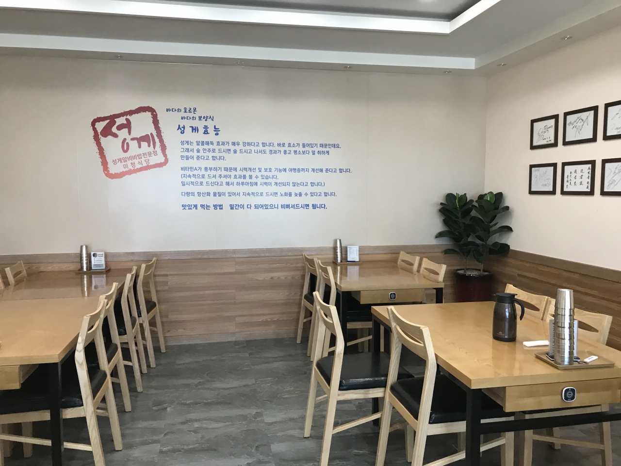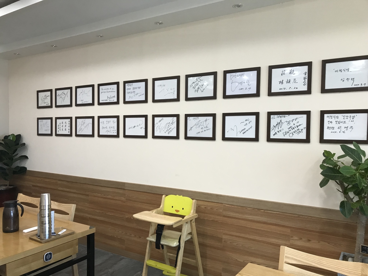 海岸沿いの新しいお店の中は韓国の食堂の雰囲気。芸能人のサイン色紙の額が壁にたくさん。店内は新築なのでとても清潔。窓側の席なら近くの日光海水浴場からの海も見える。