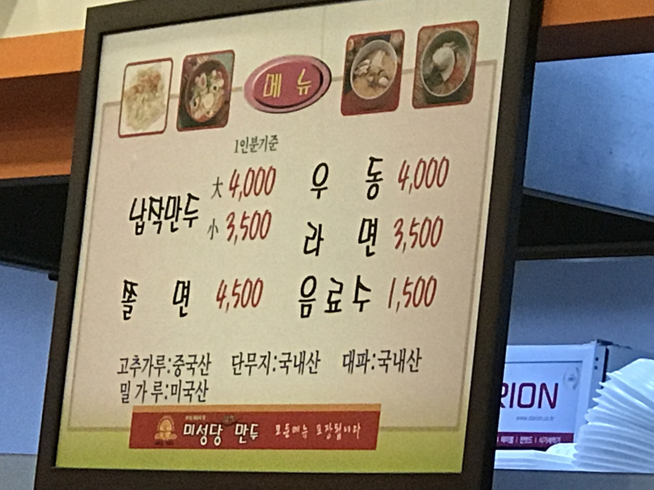 メニューはぺちゃんこ餃子であるマンドゥ(大、小)、焼餃子、うどん、インスタントラーメンなど。英語や日本語のメニューは無いので、指差しで注文。