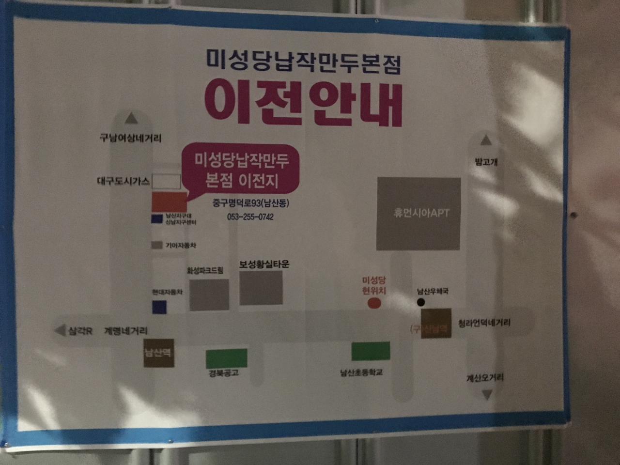 大邱名物ぺちゃんこ餃子の店。以前は新南駅(半月堂駅の次)からすぐの所にあったが、再開発で3号線南山駅から徒歩5分程の所に移転している。